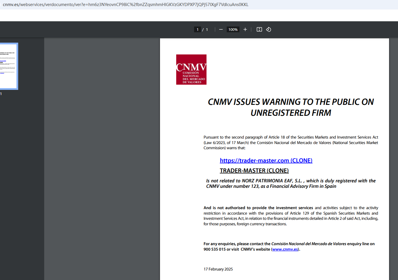 On February 17 2025, the National Securities Market Commission (CNMV) issued a warning against trader-master.com, believing this company might be providing financial services or products without proper authorization. https://www.cnmv.es/webservices/verdocumento/ver?e=hm6z3NYeovnCP98iC%2fbnZZqsmhmHlGKVzGKYDPXP7jQPj57IXgF7VdIcuAns0KKL