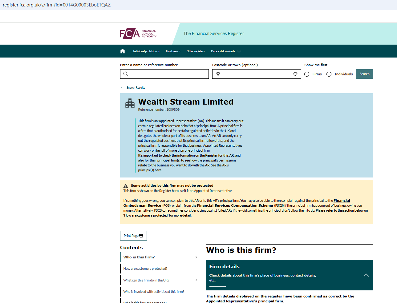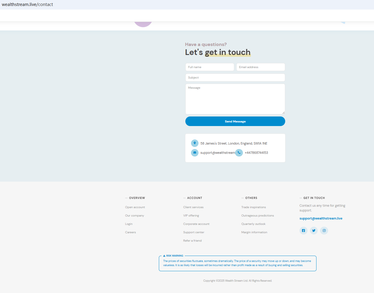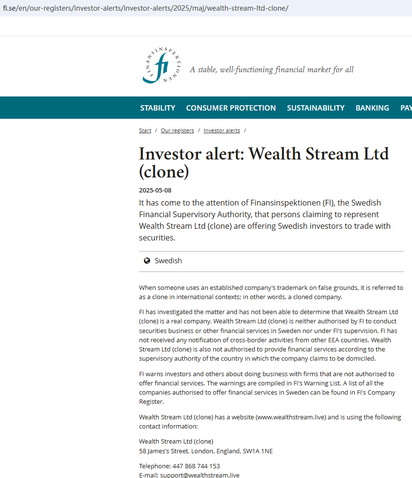 On May 8, 2025, the Finansinspektionen (FI) issued a warning against wealthstream.live, suspecting that it is not a real company. https://www.fi.se/en/our-registers/investor-alerts/investor-alerts/2025/maj/wealth-stream-ltd-clone/
