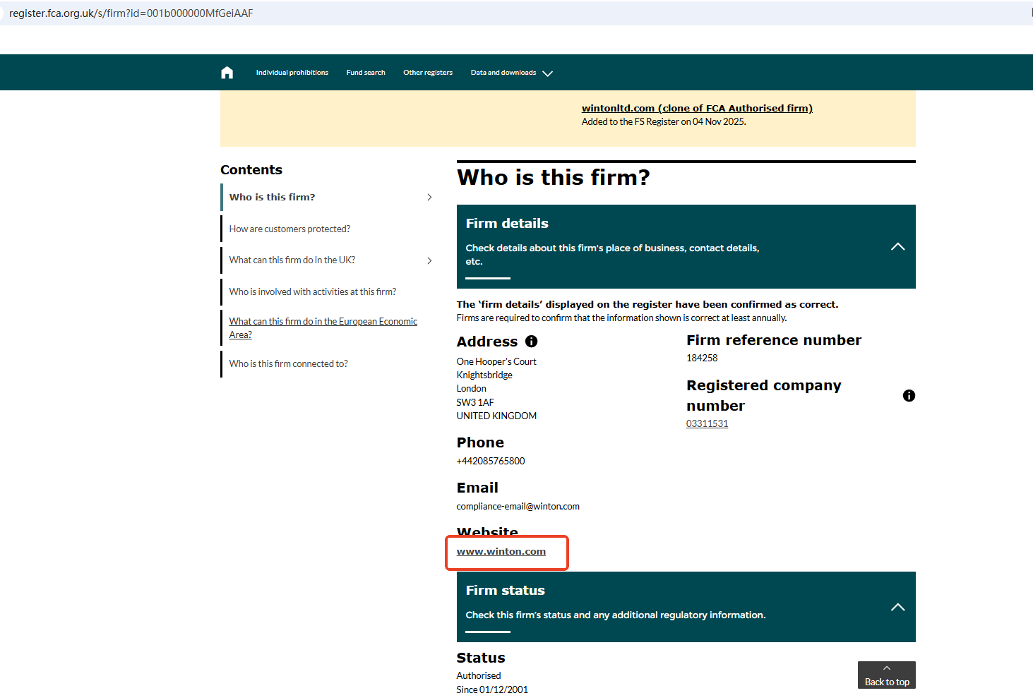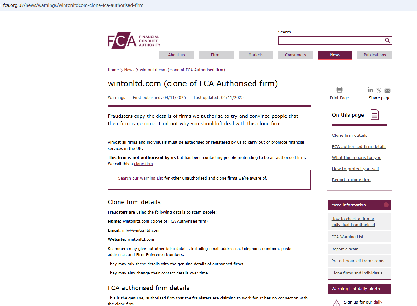 On Nov 4 2025, the Financial Conduct Authority (FCA) flagged wintonltd.com, identifying it as a clone firm. https://www.fca.org.uk/news/warnings/wintonltdcom-clone-fca-authorised-firm