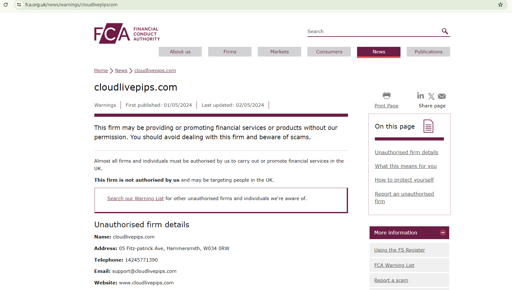While it claims to be domiciled in the UK, the Financial Conduct Authority (FCA) has issued a warning about cloudlivepips.com, flagging it as an unauthorized firm and advising investors to stay away from it.