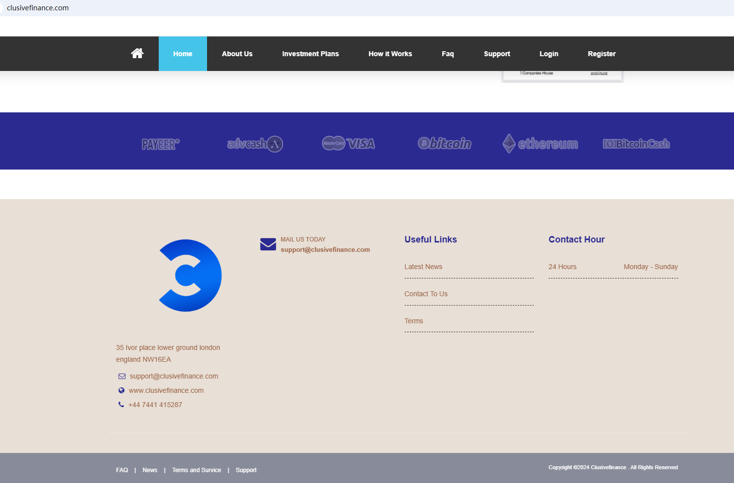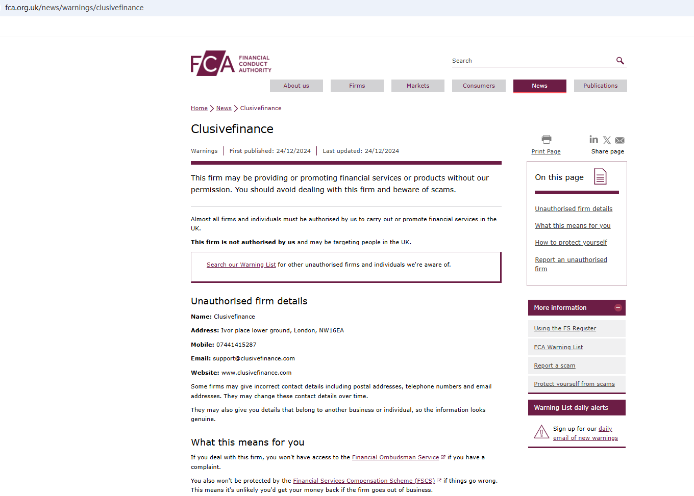 On Dec 24, 2024, the Financial Conduct Authority (FCA) issued a warning against Clusivefinance for the lack of the required authorization. https://www.fca.org.uk/news/warnings/clusivefinance