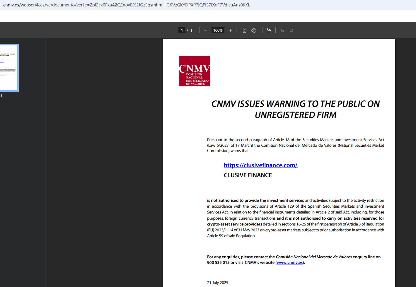 On July 21, 2025, the National Securities Market Commission (CNMV) issued a warning against Clusivefinance, believing this company might be providing financial services or products without proper authorization. https://www.cnmv.es/webservices/verdocumento/ver?e=2pI2ck0FkaA2QEnovB%2fGz5qsmhmHlGKVzGKYDPXP7jQPj57IXgF7VdIcuAns0KKL