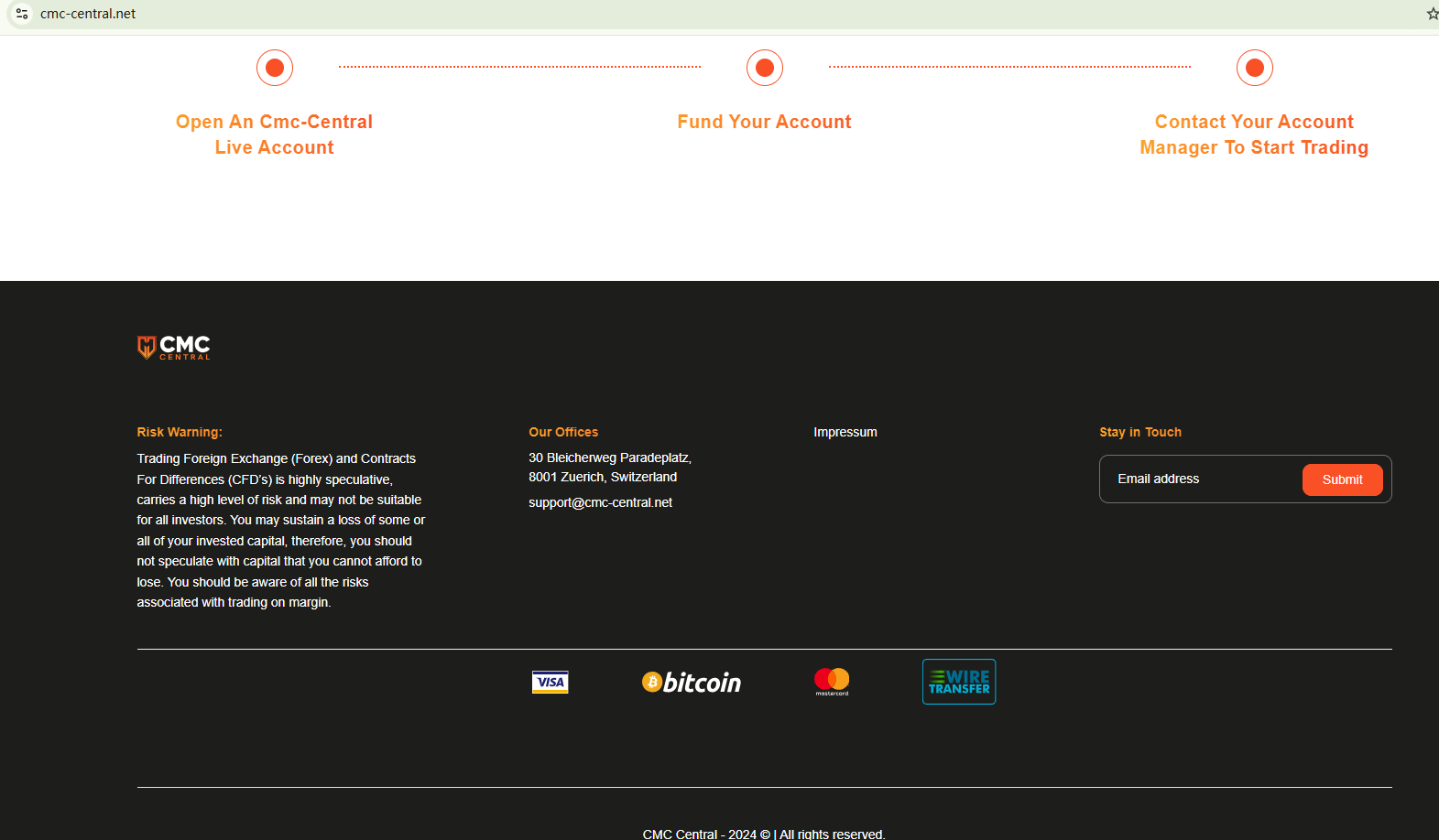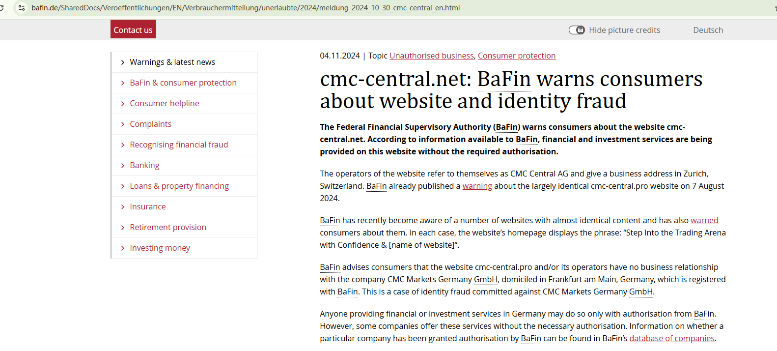 On November 4, 2024, the Federal Financial Supervisory Authority (BaFin) issued a warning against CMC Central for the lack of the required authorization. https://www.bafin.de/SharedDocs/Veroeffentlichungen/EN/Verbrauchermitteilung/unerlaubte/2024/meldung_2024_10_30_cmc_central_en.html