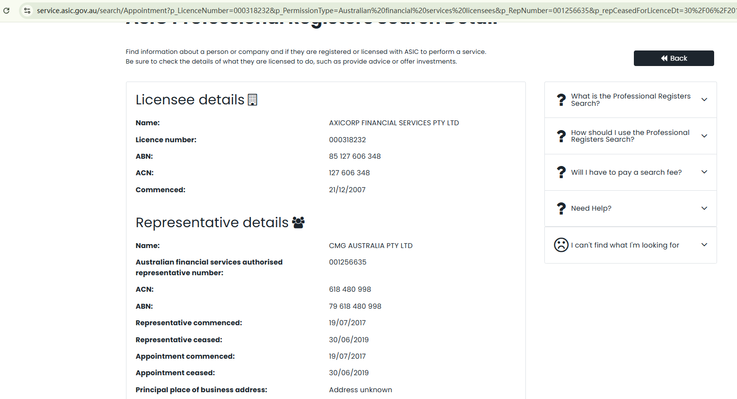 In addition, while we found a CMG AUSTRALIA PTY LTD on the register of the Australian Securities and Investments Commission (ASIC), a representative authorized by Axi, the appointment was ceased in 2019.