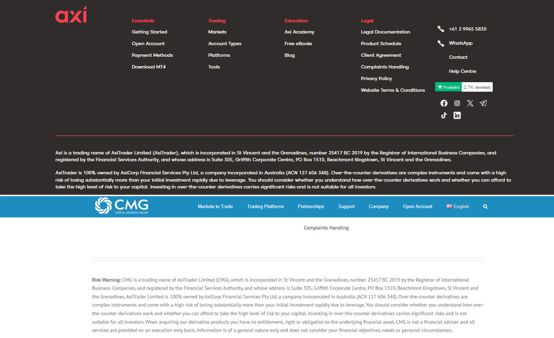 CMG seems to have copied the registration and licensing information of a legitimate broker, Axi, to appear genuine. Our close comparison suggests that CMG only replaced the branding name with their own when copying such information.