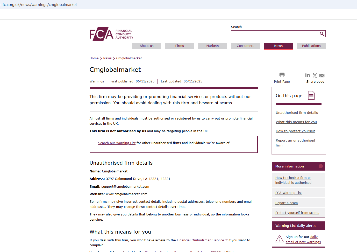 On Nov 6, 2025, the Financial Conduct Authority (FCA) issued a warning regarding Cmglobalmarket, suspecting that this company may be offering financial services or products without the necessary authorization. https://www.fca.org.uk/news/warnings/cmglobalmarket
