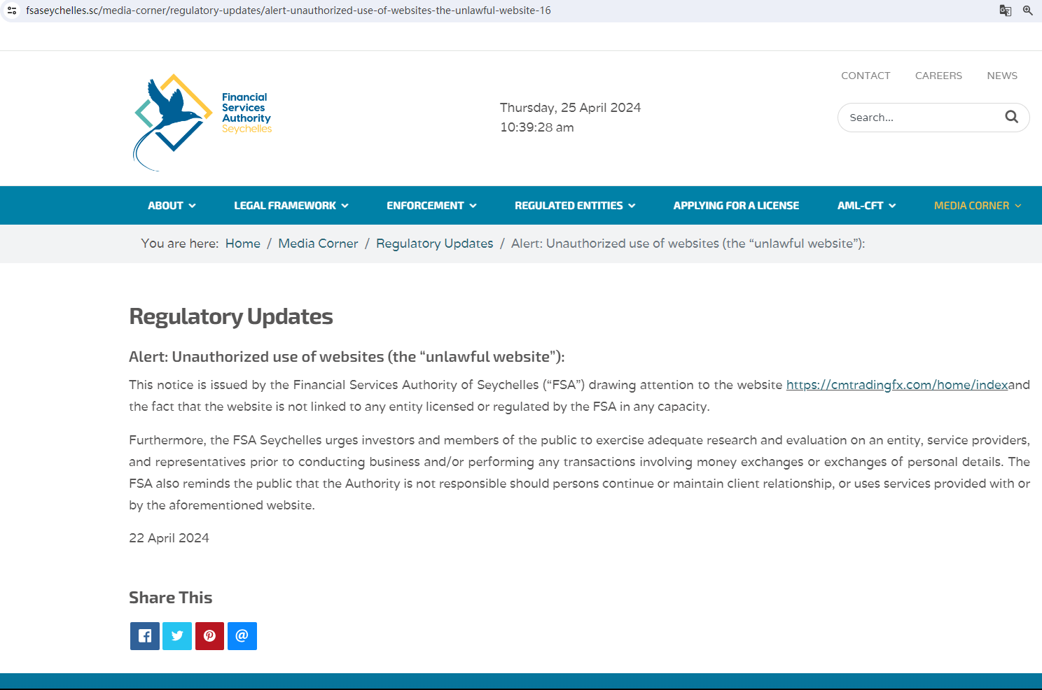 In addition, the Seychelles Financial Services Authority (Seychelles FSA) issued a warning that cmtradingfx.com was an unlawful website.