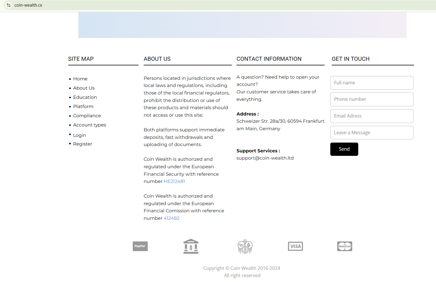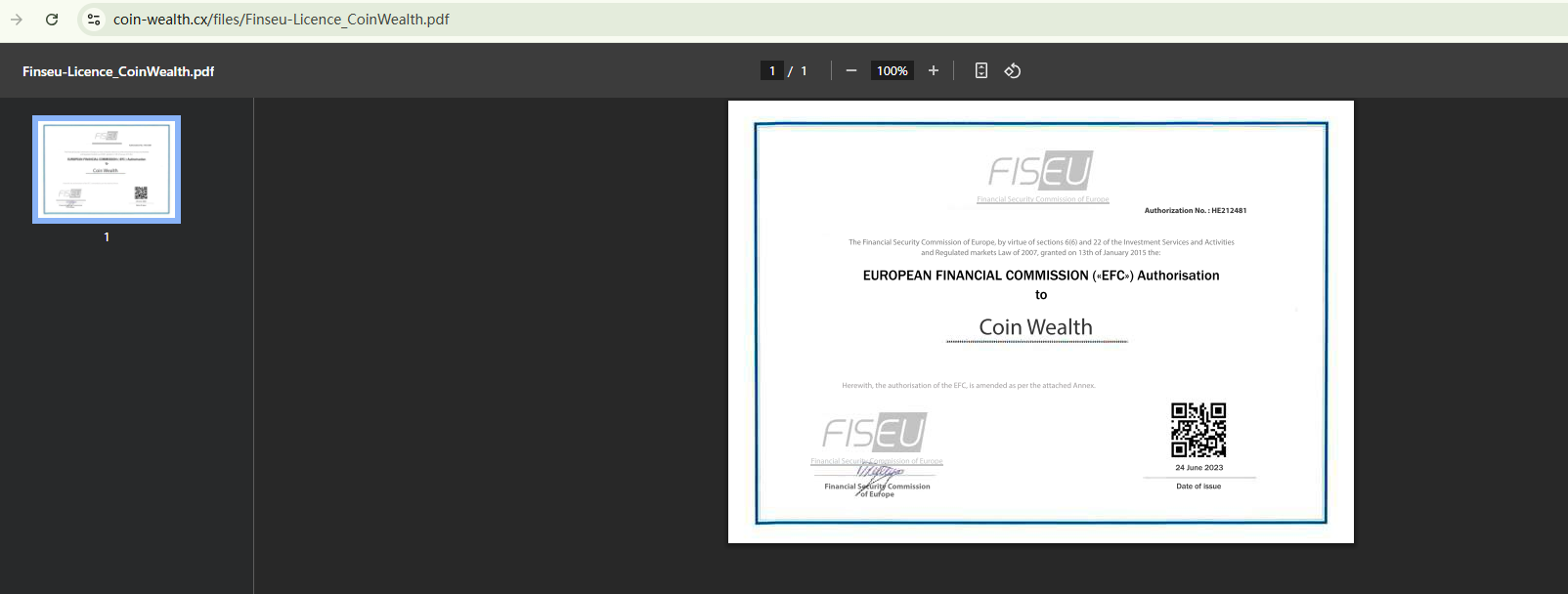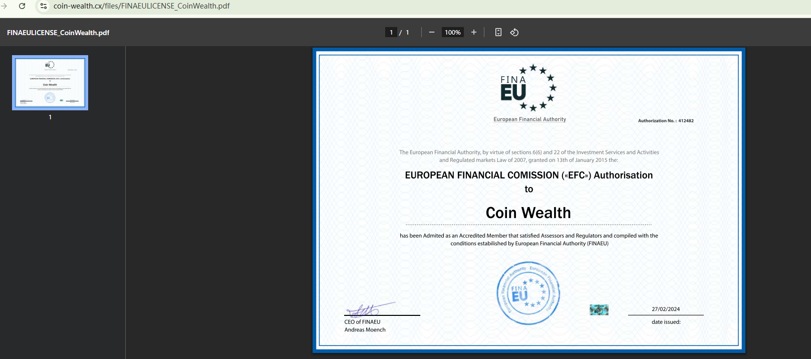 Coin Wealth attempts to create the illusion of legitimacy by falsely claiming to be regulated or authorized. In the footer of its website, it displays two links leading to fabricated certificates—one from FISEU and the other from FINAEU. Both entities are fake authorities that have been flagged by major financial regulators for their deceptive practices.