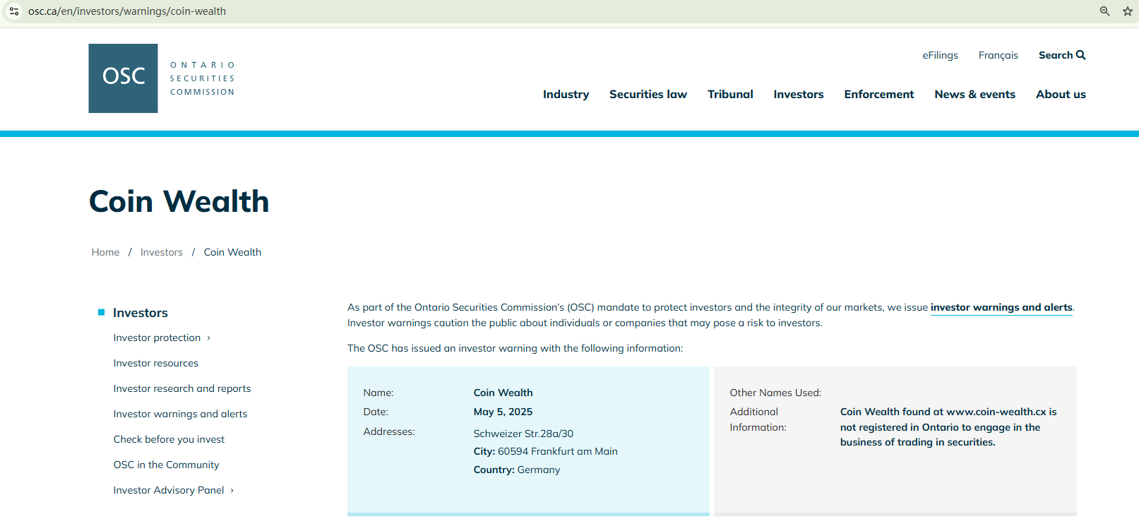 Additionally, the Ontario Securities Commission (OSC) has issued an official warning against Coin Wealth, confirming that the broker is not registered in Ontario and is unauthorized to engage in the business of trading securities.