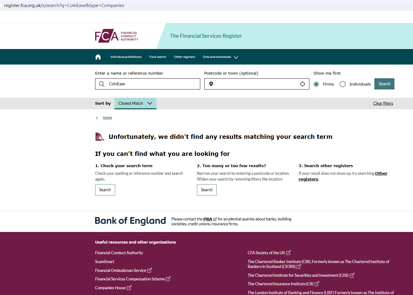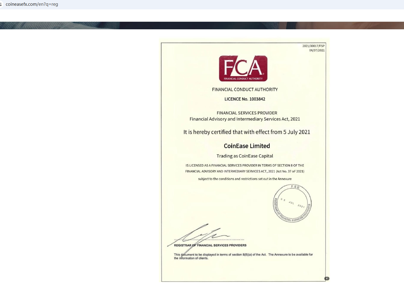 It displayed a Financial Conduct Authority (FCA) authorization certificate on its website. However, a search revealed no matching information with the FCA. In addition, the New Zealand Financial Markets Authority (NZ FMA) added CoinEase Limited to its warning list, stating that this is a fake investment platform.
