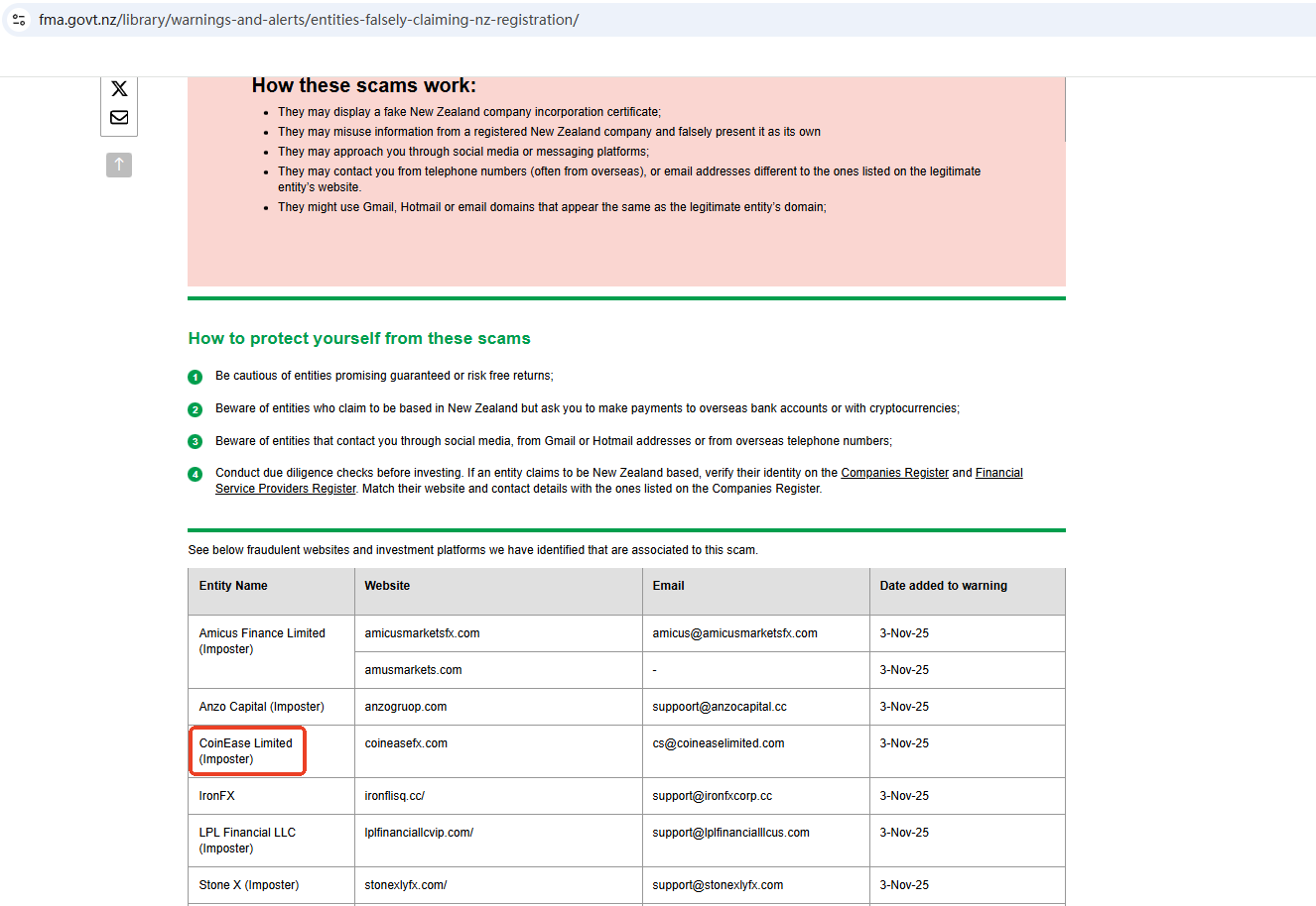 On Nov 3, 2025, the New Zealand Financial Markets Authority (NZ FMA) added CoinEase Limited its warning list, stating that this is a fake investment platform. https://www.fma.govt.nz/library/warnings-and-alerts/entities-falsely-claiming-nz-registration/