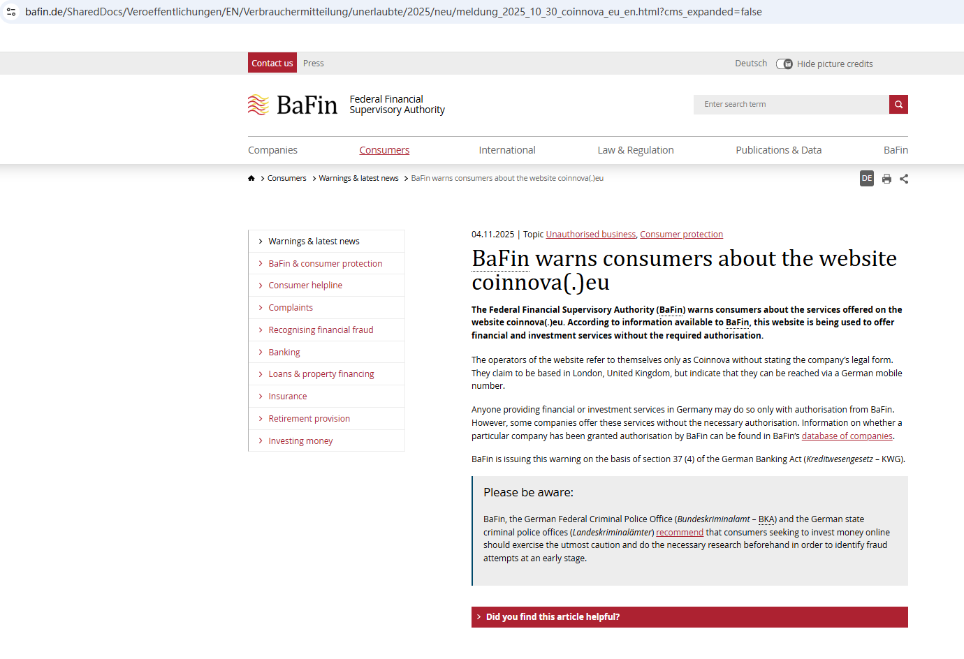 On Nov 4, 2025, the Federal Financial Supervisory Authority (BaFin) issued a warning against Coinnova for the lack of the required authorization. https://www.bafin.de/SharedDocs/Veroeffentlichungen/EN/Verbrauchermitteilung/unerlaubte/2025/neu/meldung_2025_10_30_coinnova_eu_en.html?cms_expanded=false
