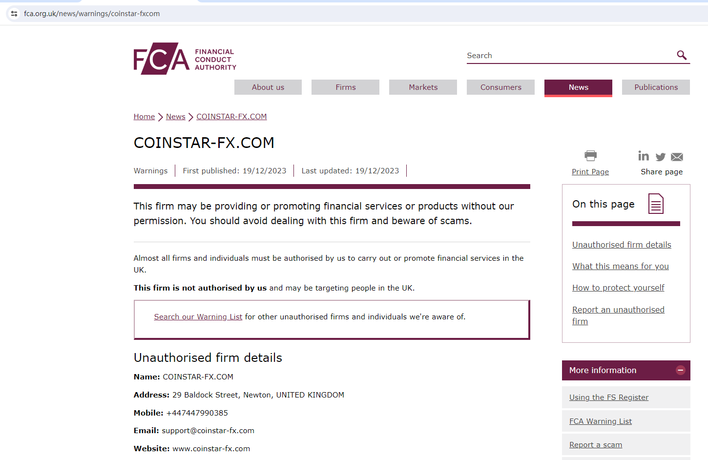 On 19 December 2023, the United Kingdom Financial Conduct Authority (UK FCA) issued a warning that coinstar-fx.com was providing financial services or products in the UK without authorisation. You may visit: https://www.fca.org.uk/news/warnings/coinstar-fxcom