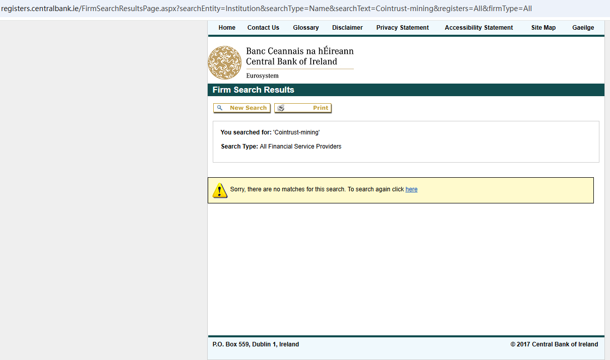Upon investigation, we found that Cointrust-mining is not authorized and regulated by the Central Bank of Ireland(CBI).