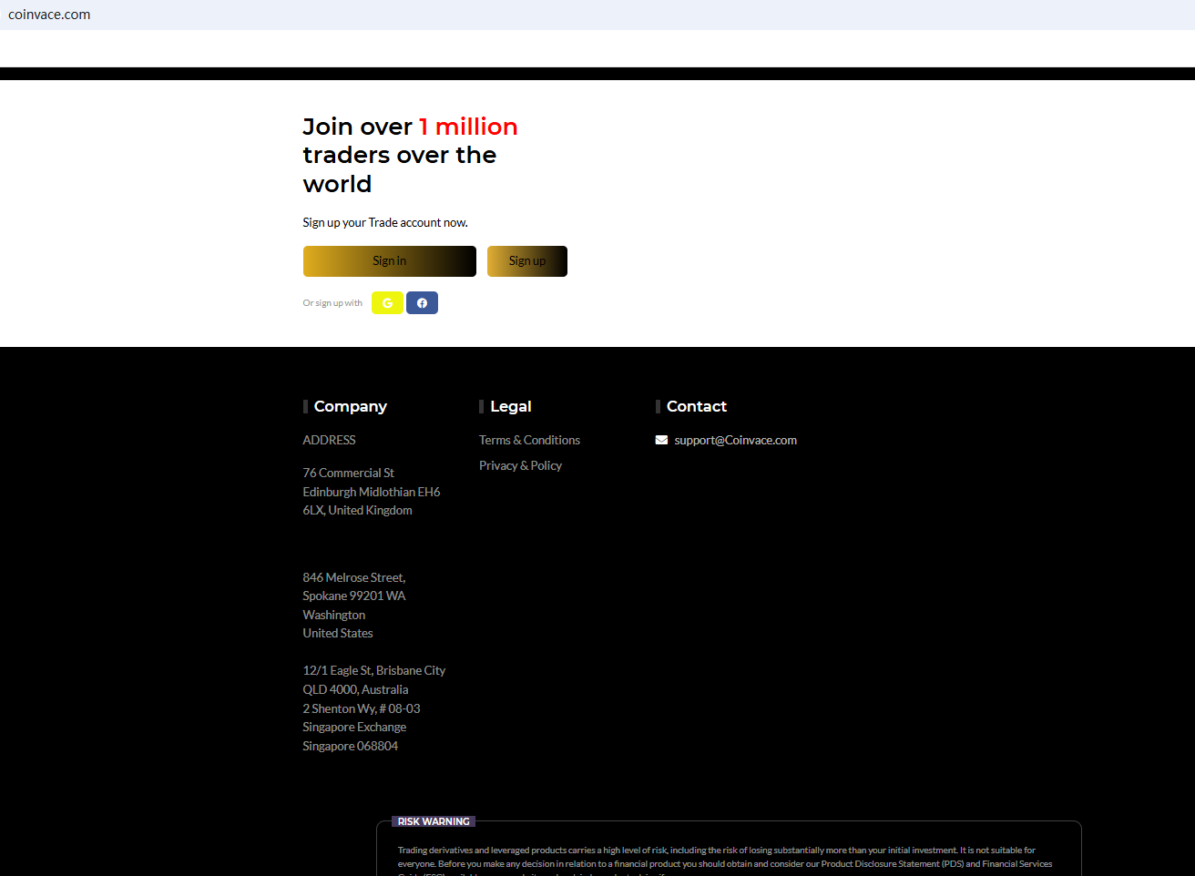 This website uses a common scam website template and has been flagged multiple times by Brokersview. Such websites often share similar website designs and sales pitches. Coinvace claims to have offices in various countries. However, no matching information has been found with the National Futures Association (NFA) or the Monetary Authority of Singapore (MAS). Furthermore, the Financial Conduct Authority (FCA) issued a warning regarding Coinvace, suspecting that this company may be offering financial services or products without the necessary authorization.