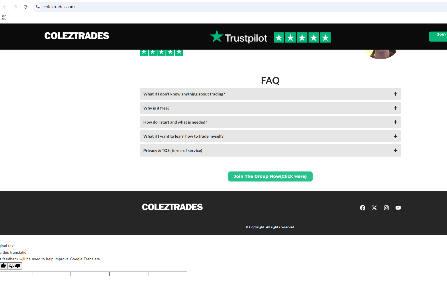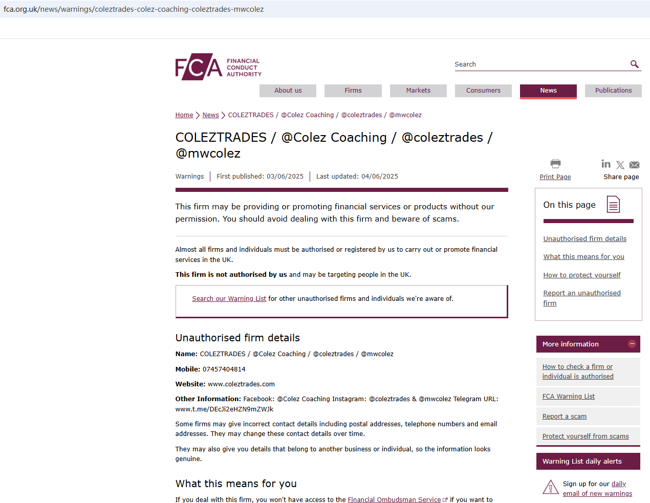 On Jun 4, 2025, the Financial Conduct Authority (FCA) issued a warning against COLEZTRADES, believing this company might be providing financial services or products without proper authorization in the UK. https://www.fca.org.uk/news/warnings/coleztrades-colez-coaching-coleztrades-mwcolez