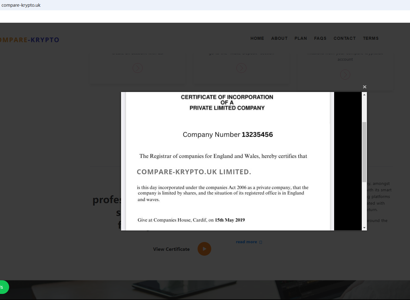 According to its website, it is located in the United Kingdom and displays a certificate of Companies House (CH) on the website. As we all know, in order to obtain the right to exercise foreign exchange in the United Kingdom, it is not enough to simply have a registration certificate of CH. CH does not have the right to regulate foreign exchange. However, we found that the Financial Conduct Authority (FCA) issued a warning against COMPARE KRYPTO (aka COMPAREKRYPTO.UK LIMITED), believing this company might be providing financial services or products without proper authorization in the UK.
