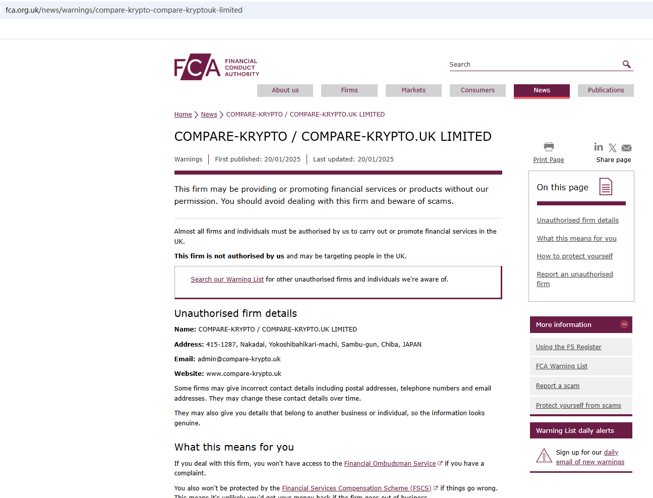 On January 20, 2025, the Financial Conduct Authority (FCA) issued a warning against COMPARE KRYPTO (aka COMPAREKRYPTO.UK LIMITED), believing this company might be providing financial services or products without proper authorization in the UK. https://www.fca.org.uk/news/warnings/compare-krypto-compare-kryptouk-limited