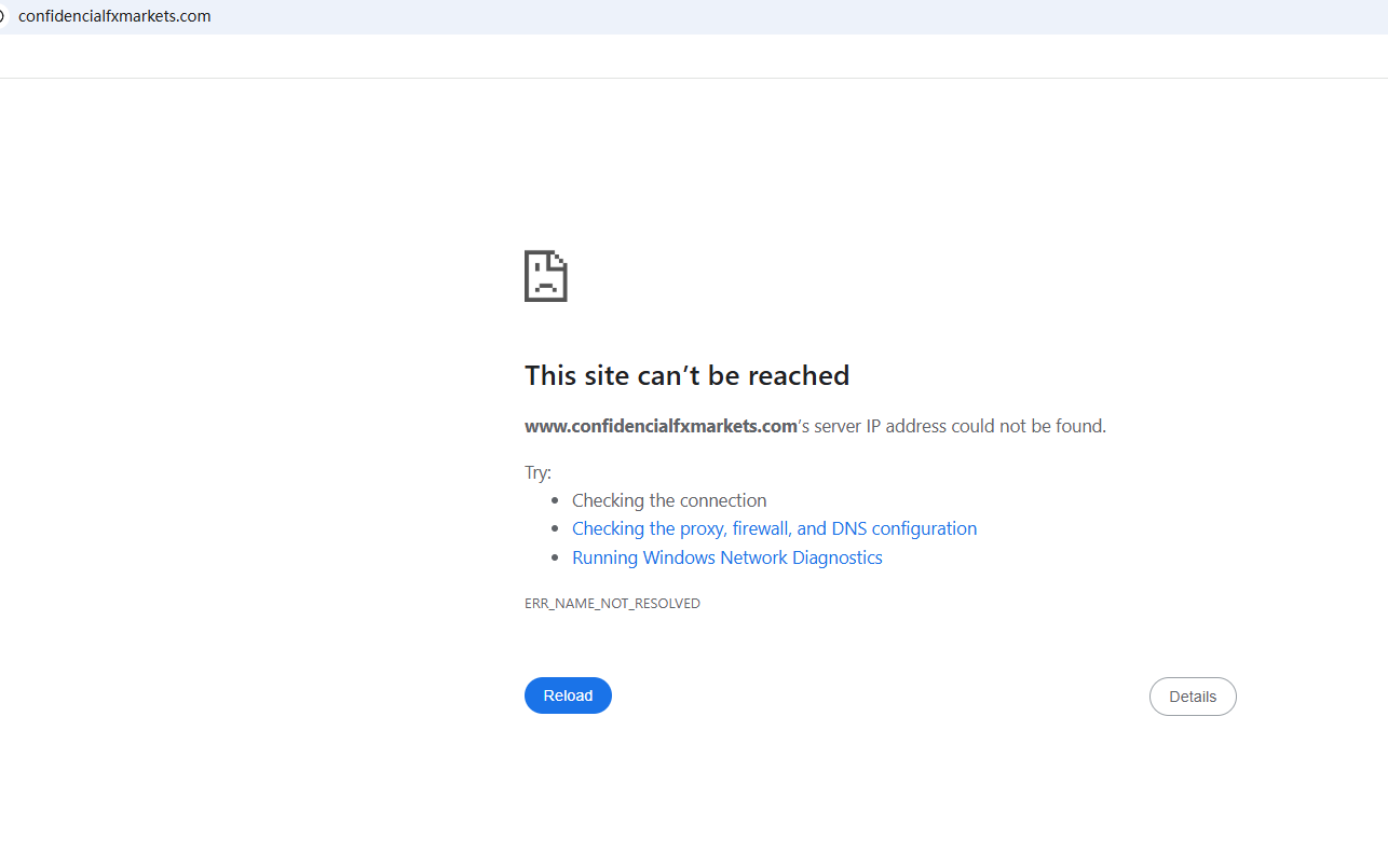 BrokersView found that the domain "https://www.confidencialfxmarkets.com/" is currently inaccessible. This is widely regarded as a significant red flag, as the suspension of a broker's website often points to underlying regulatory or operational issues.