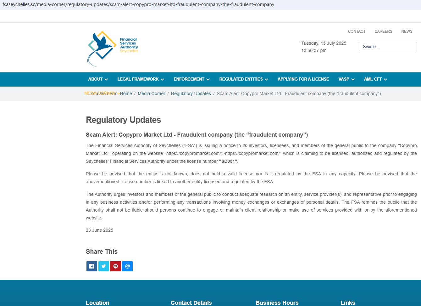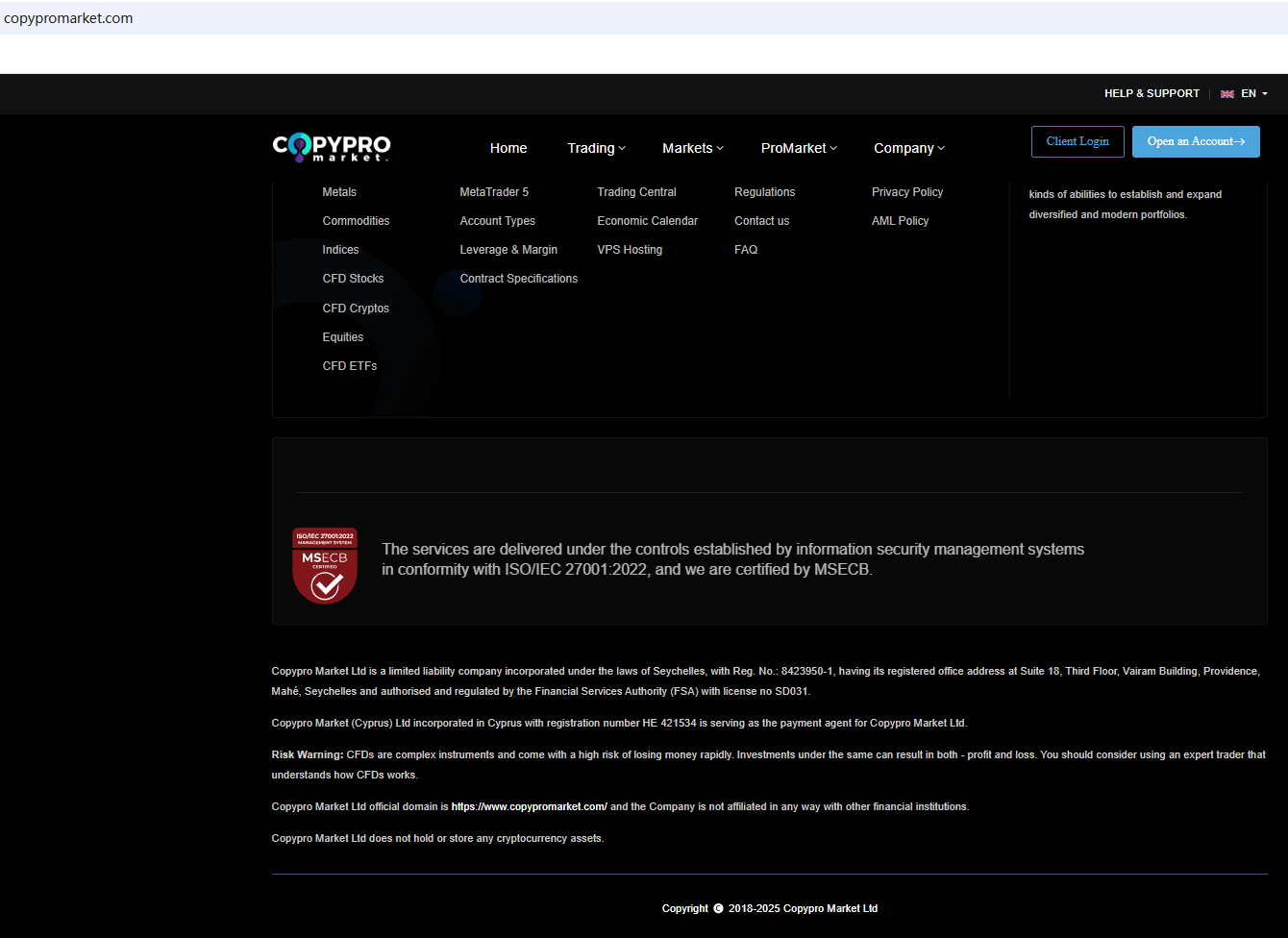 According to its website, it claims to be registered in both the Seychelles and Cyprus. Upon investigation, no matching information was found in the Cyprus Securities and Exchange Commission (CySEC). In addition, we found that the Seychelles Financial Services Authority (Seychelles FSA) issued a warning against Copypro Market for the lack of the required authorization.