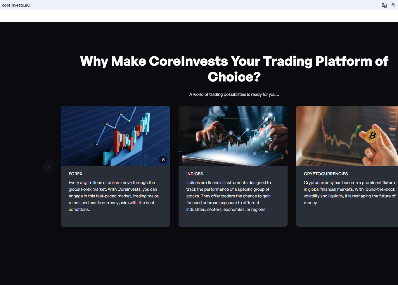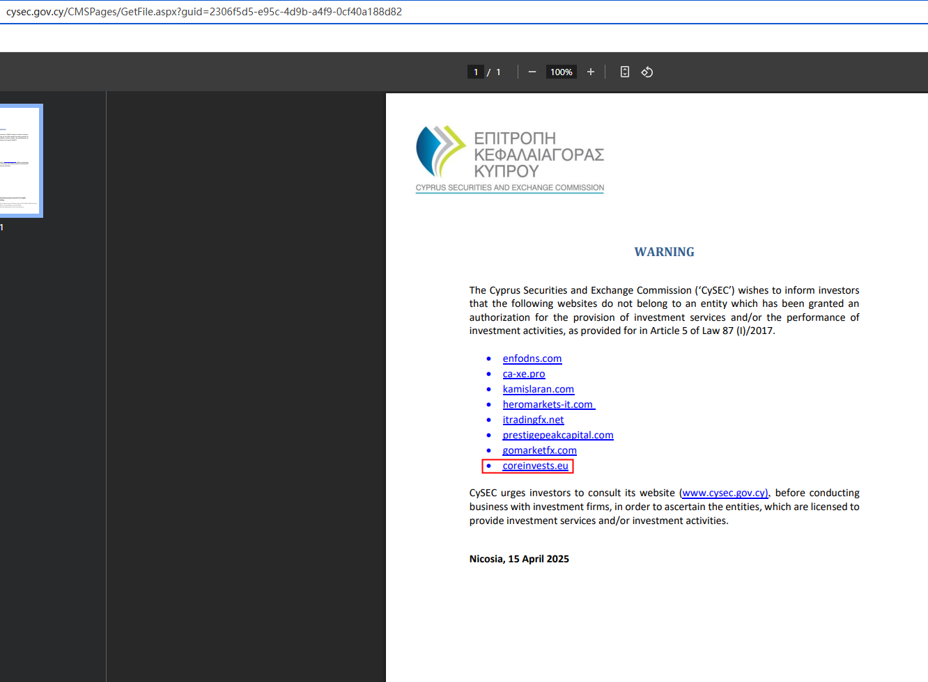 On April 15, 2025, the Cyprus Securities and Exchange Commission (CySEC) issued a warning against CoreInvests, believing this company might be providing financial services or products without authorisation. You may visit: https://www.cysec.gov.cy/CMSPages/GetFile.aspx?guid=2306f5d5-e95c-4d9b-a4f9-0cf40a188d82