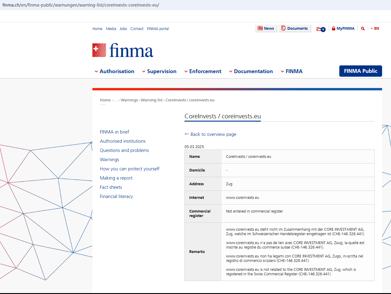 On March 5 2025, the Swiss Financial Market Supervisory Authority (FINMA) issued a warning against CoreInvests, stating that this broker is not entered in its commercial register. https://www.finma.ch/en/finma-public/warnungen/warning-list/coreinvests-coreinvests-eu/