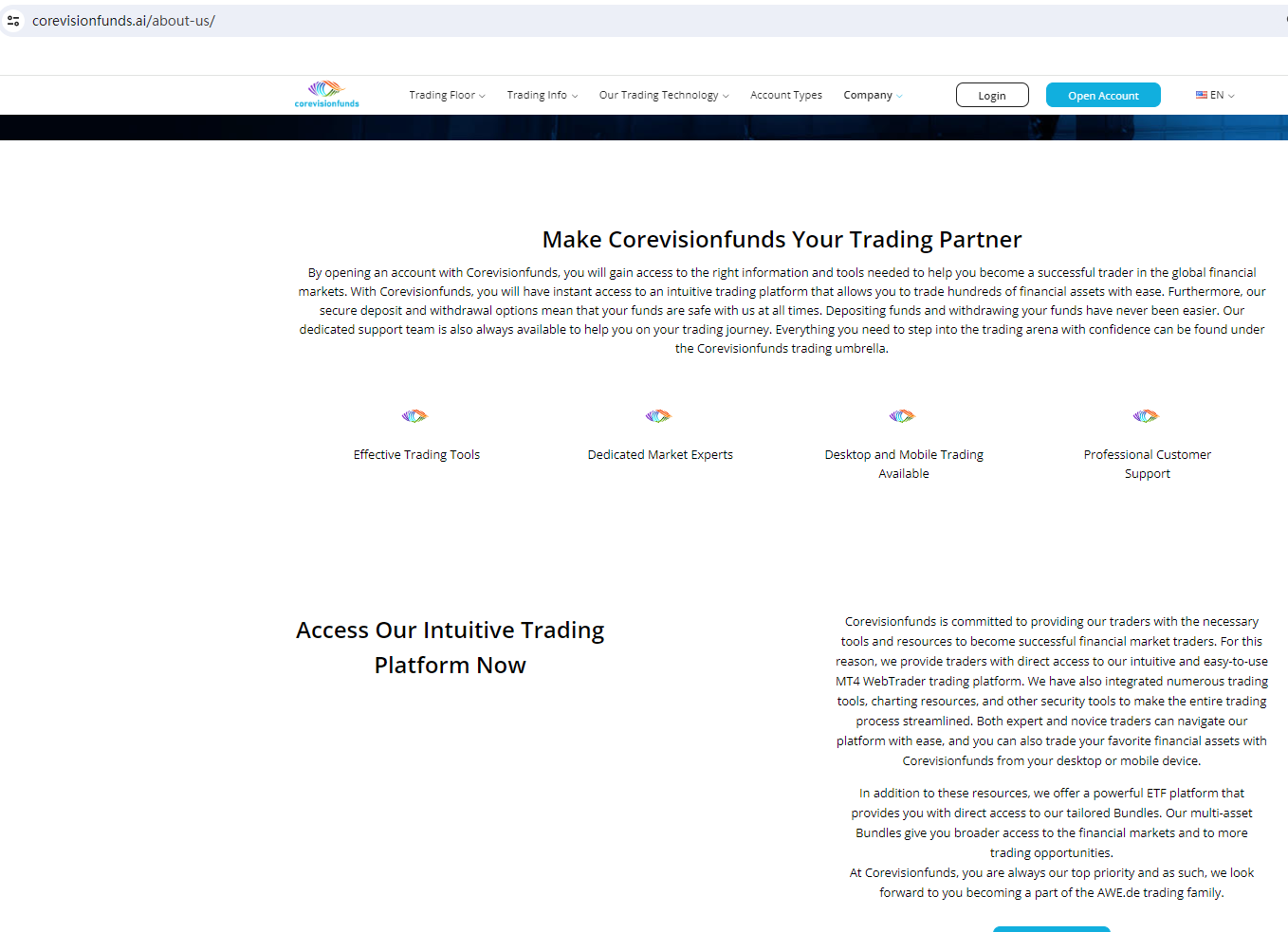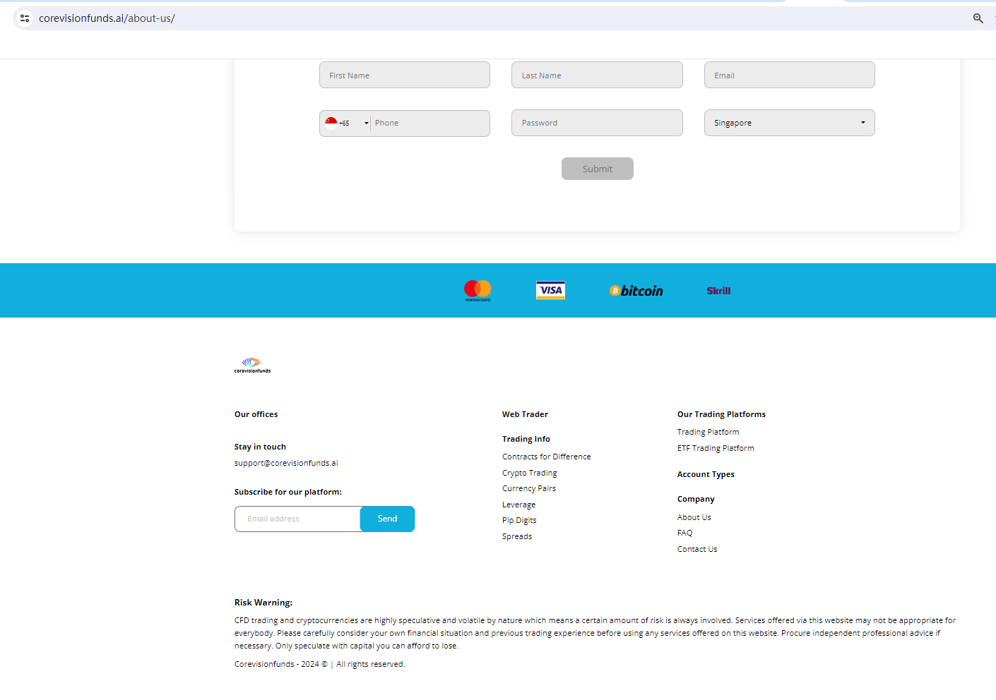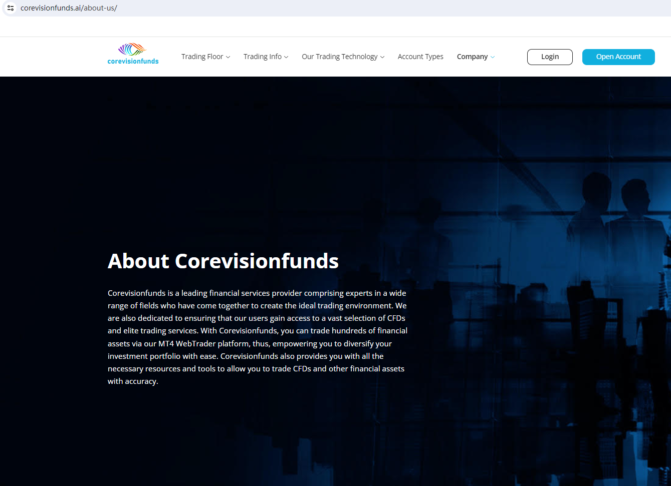 Corevisionfunds claims to be a reliable company without presenting any information about its regulation or contact. The lack of such important information may be a distinct signal of an unlicensed broker, as regulated companies always present their accreditations and licenses in a prominent position. It is a red flag.