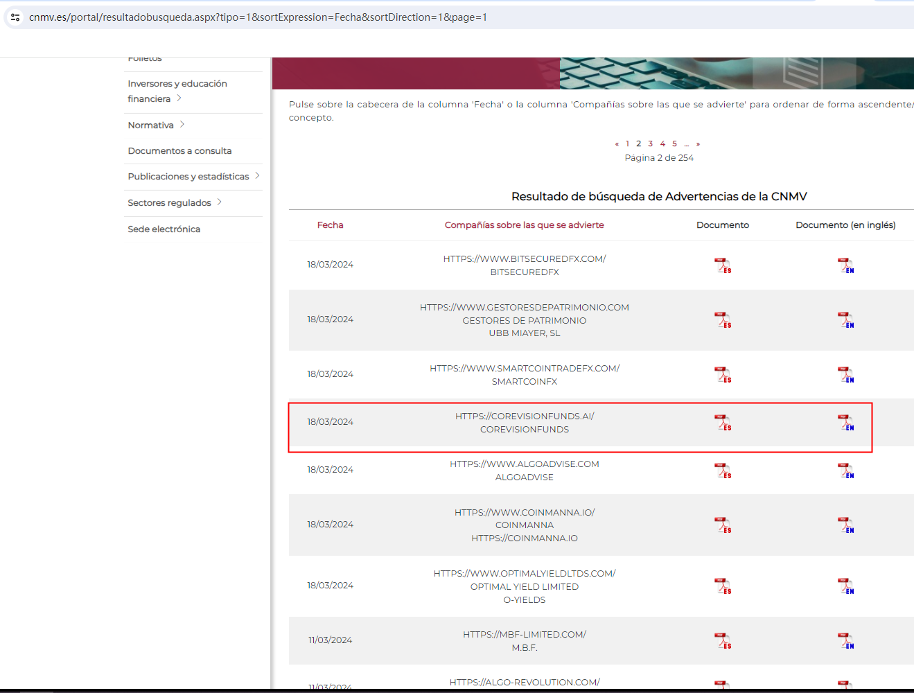 In addition, the Comisión Nacional del Mercado de Valores (CNMV) added Corevisionfunds to its warning list for providing investment services without authorization.