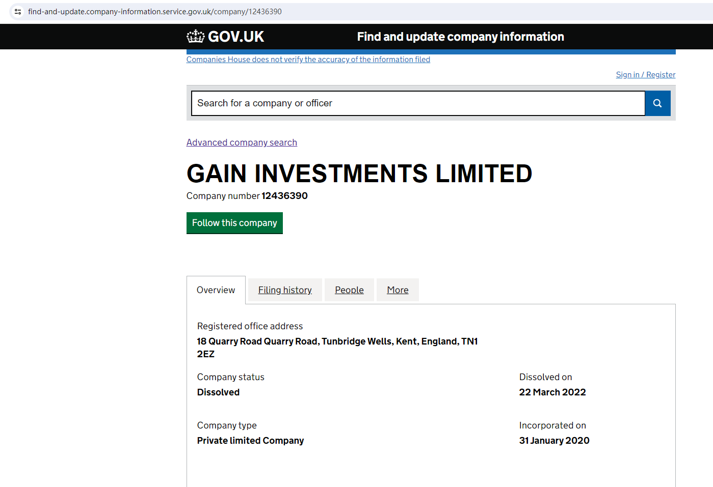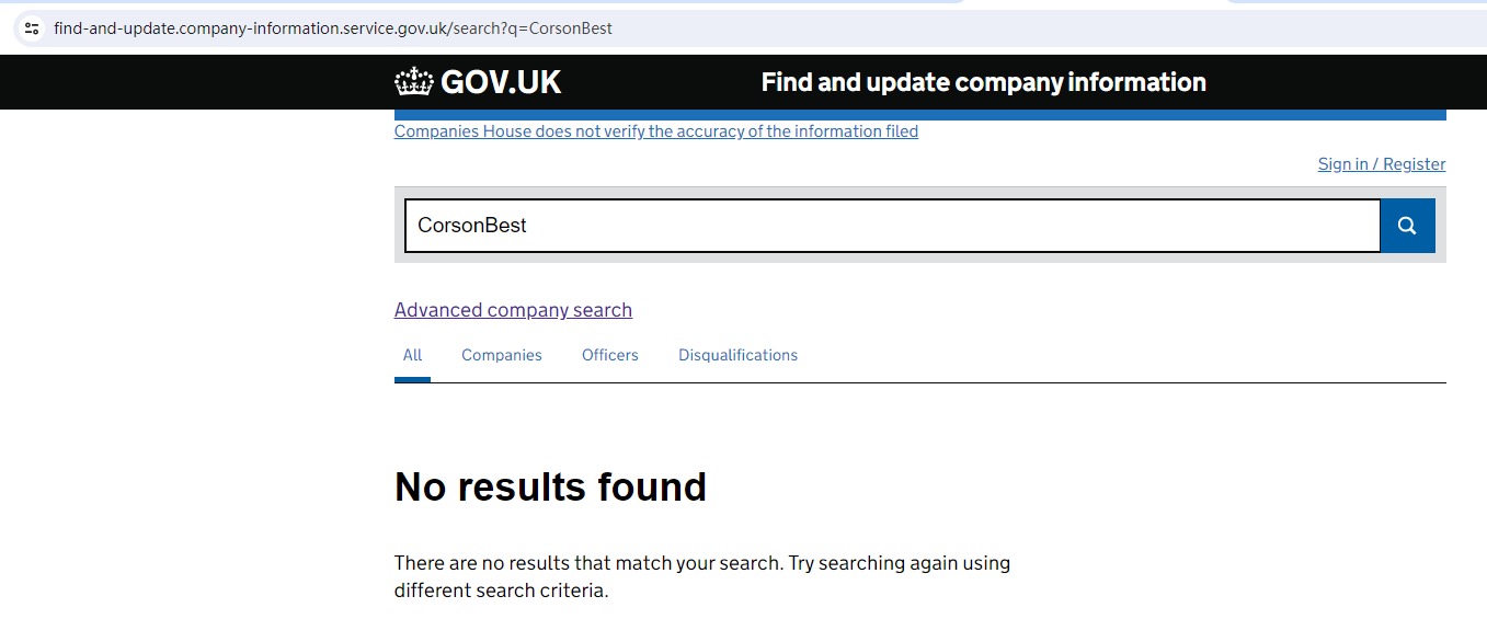 CorsonBest claims to be registered under the UK Companies House (CH). We searched by the company number 12436390 but found a mismatch for one company GAIN INVESTMENTS LIMITED which was dissolved, when we searched by the company name CorsonBest there were no results.