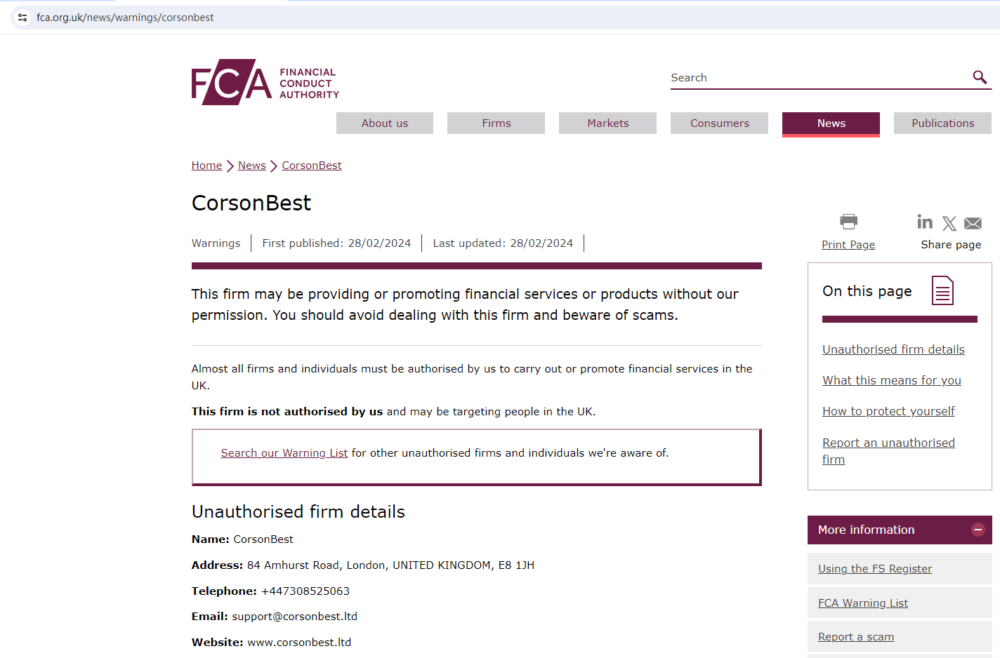 On 28 February 2024, the United Kingdom Financial Conduct Authority (UK FCA) issued a warning that CorsonBest was providing financial services or products in the UK without authorisation. You may visit: https://www.fca.org.uk/news/warnings/corsonbest