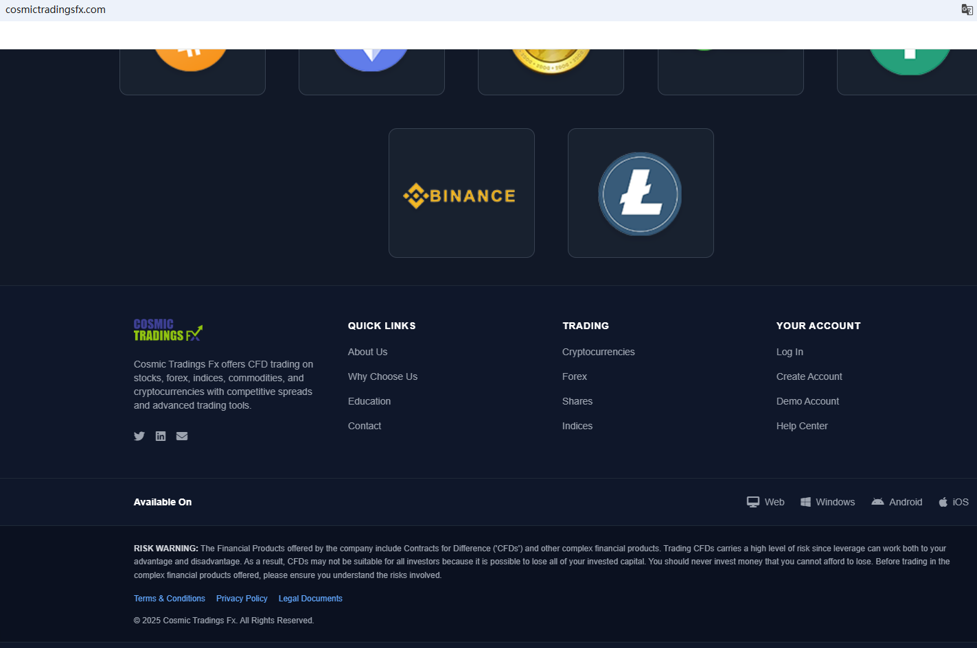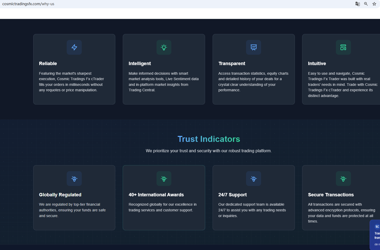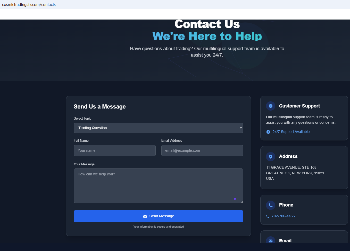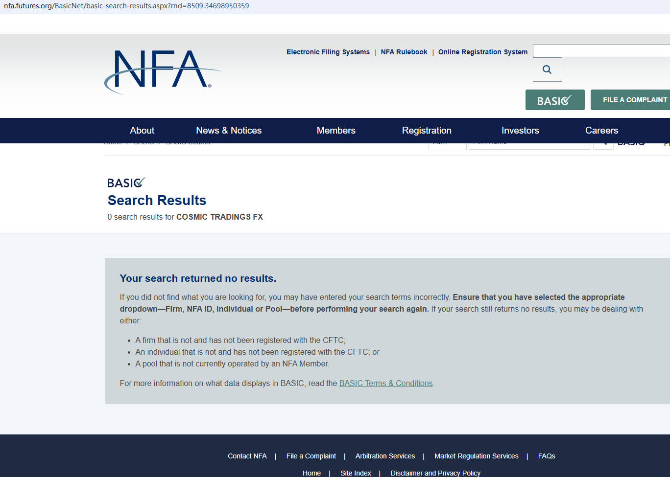 According to its website, it repeatedly emphasizes that it is subject to top global regulation, but it does not display a single piece of evidence of strong regulation on the website. It claims that its office is located in the United States, but after searching, no matching information was found in the National Futures Association (NFA). In addition, the Financial Conduct Authority (FCA) issued a warning regarding Cosmic Tradings Fx, suspecting that this company may be offering financial services or products without the necessary authorization.