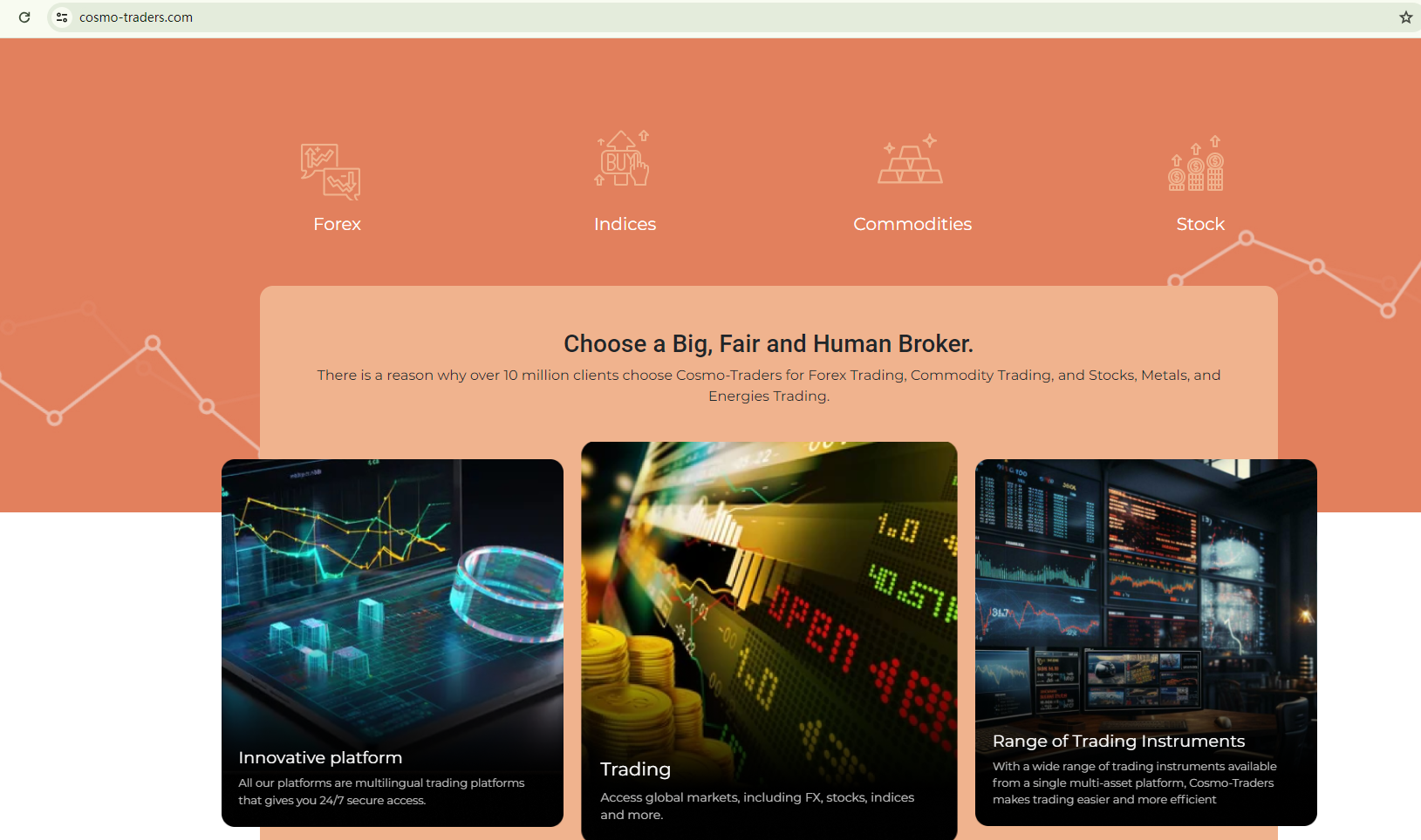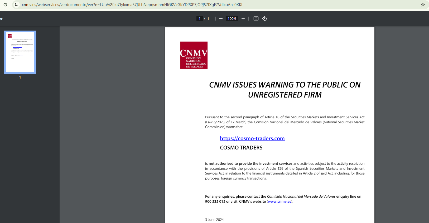On June 3, 2024, the Comisión Nacional del Mercado de Valores (CNMV) added Cosmo Traders to its warning list for providing investment services without authorization. https://www.cnmv.es/portal/ResultadoBusqueda.aspx?tipo=1&nombre=COSMO