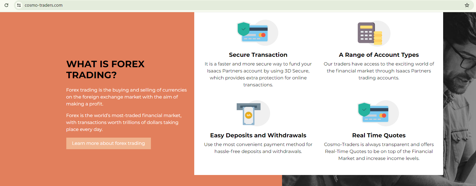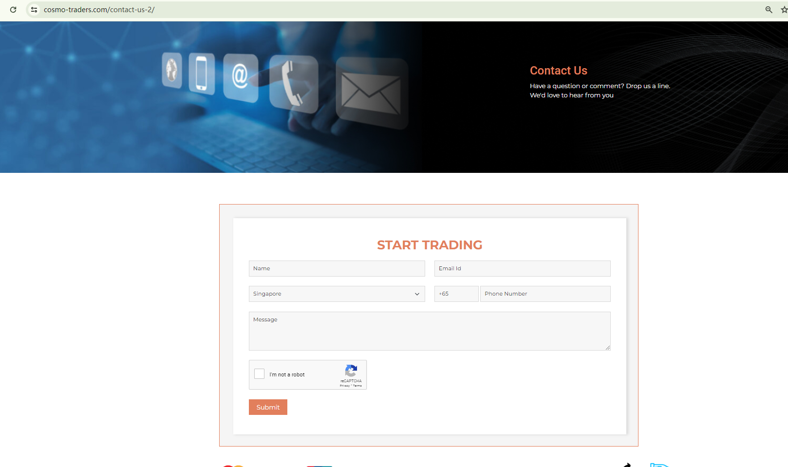 Cosmo Traders has not provided any company information that would allow investors to confirm its authenticity or legitimacy. The only means of communication provided on their Contact page is a web form, which means the operators control the initiation of communication. This lack of transparency is a significant indicator of a potential scam, as it would be difficult for investors and authorities to contact or trace the broker if they were to disappear without notice.