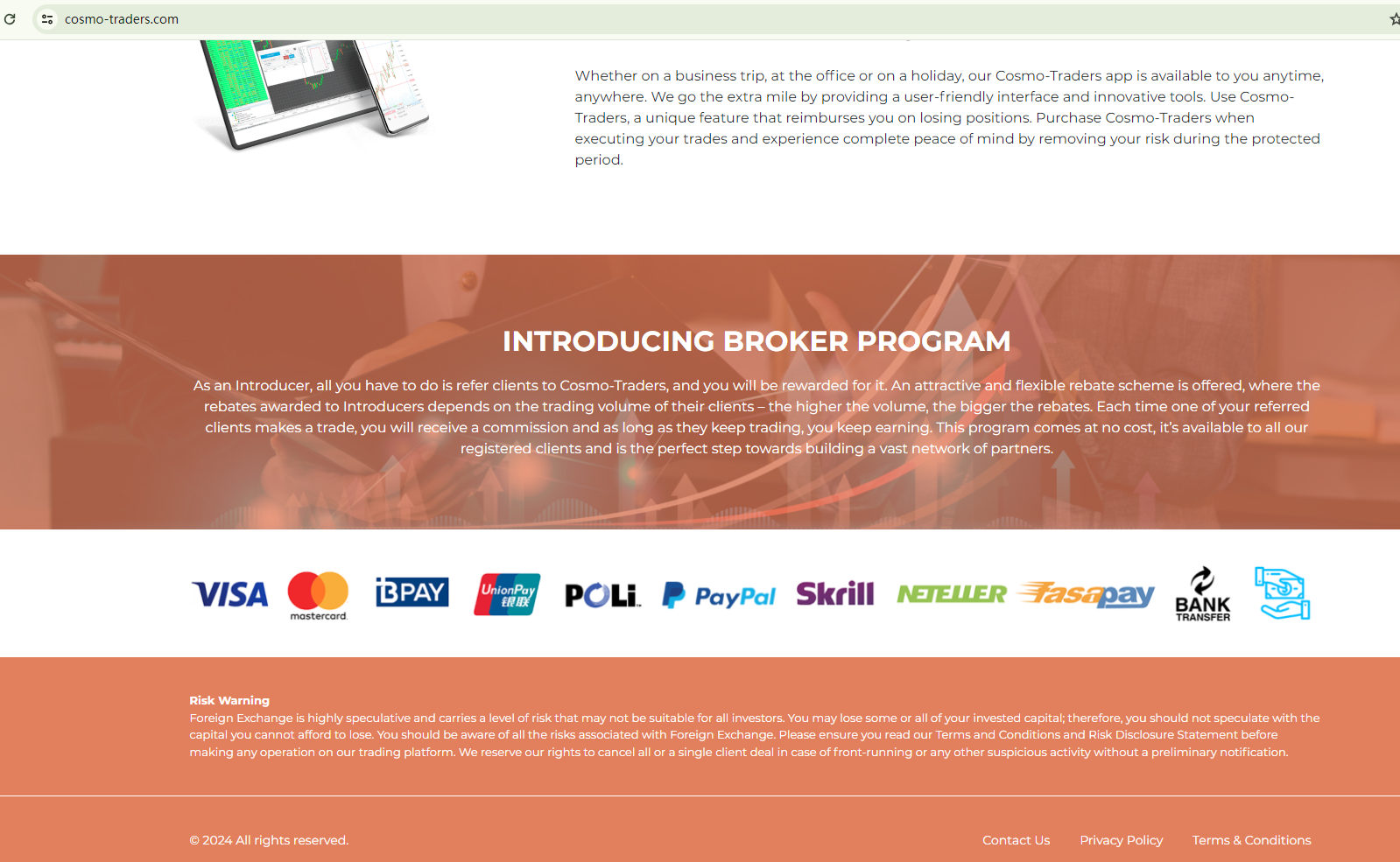 In essence, Cosmo Traders is not regulated by any governing body. Entrusting it with investors' funds is highly risky, as there are no legal protections in place to safeguard the funds.