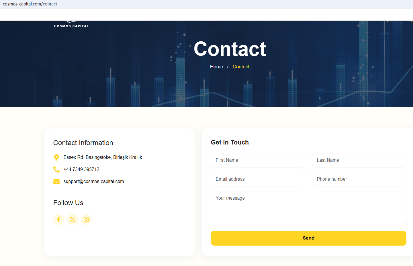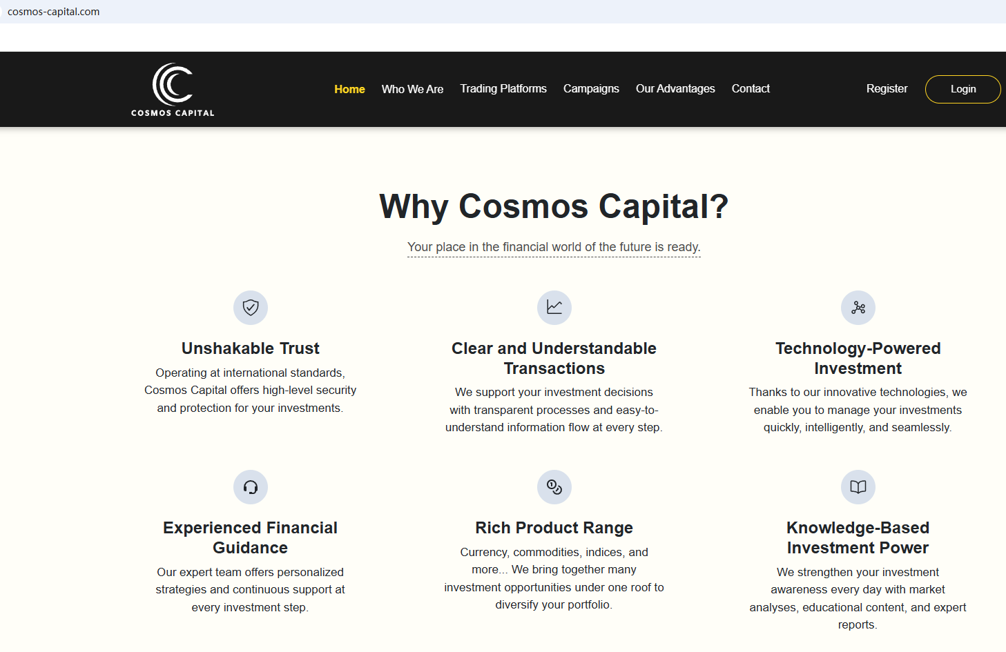 According to its website, it is located in the UK. Upon investigation, no matching information was found in the Financial Conduct Authority (FCA). In addition, the Australian Securities & Investments Commission (ASIC) issued a warning against Cosmos Capital, believing this company might be providing financial services or products without proper authorization.
