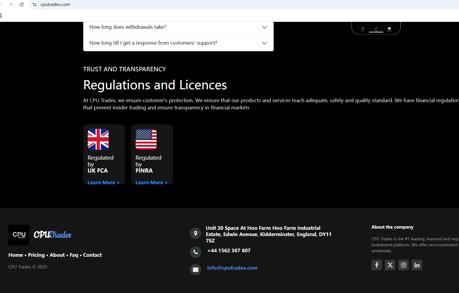 In essence, cputrades.com is not regulated by any governing body. Entrusting it with investors' funds is highly risky, as there are no legal protections in place to safeguard the funds.