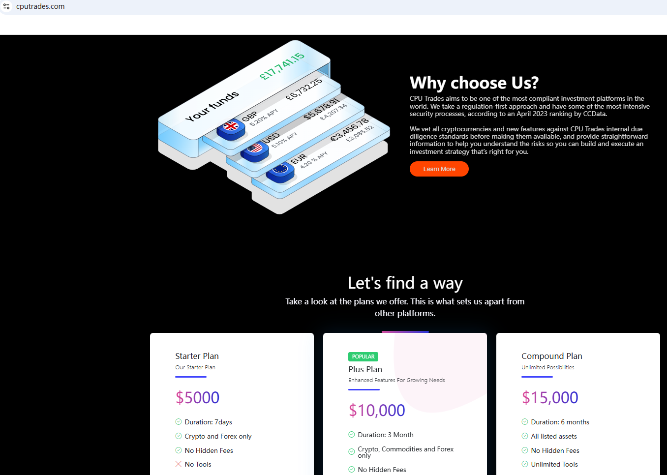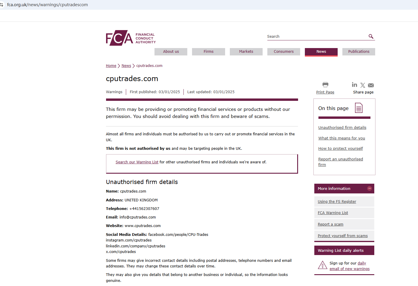 On January 3, 2025, the Financial Conduct Authority (FCA) issued a warning against cputrades.com, believing this company might be providing financial services or products without proper authorization in the UK. https://www.fca.org.uk/news/warnings/cputradescom