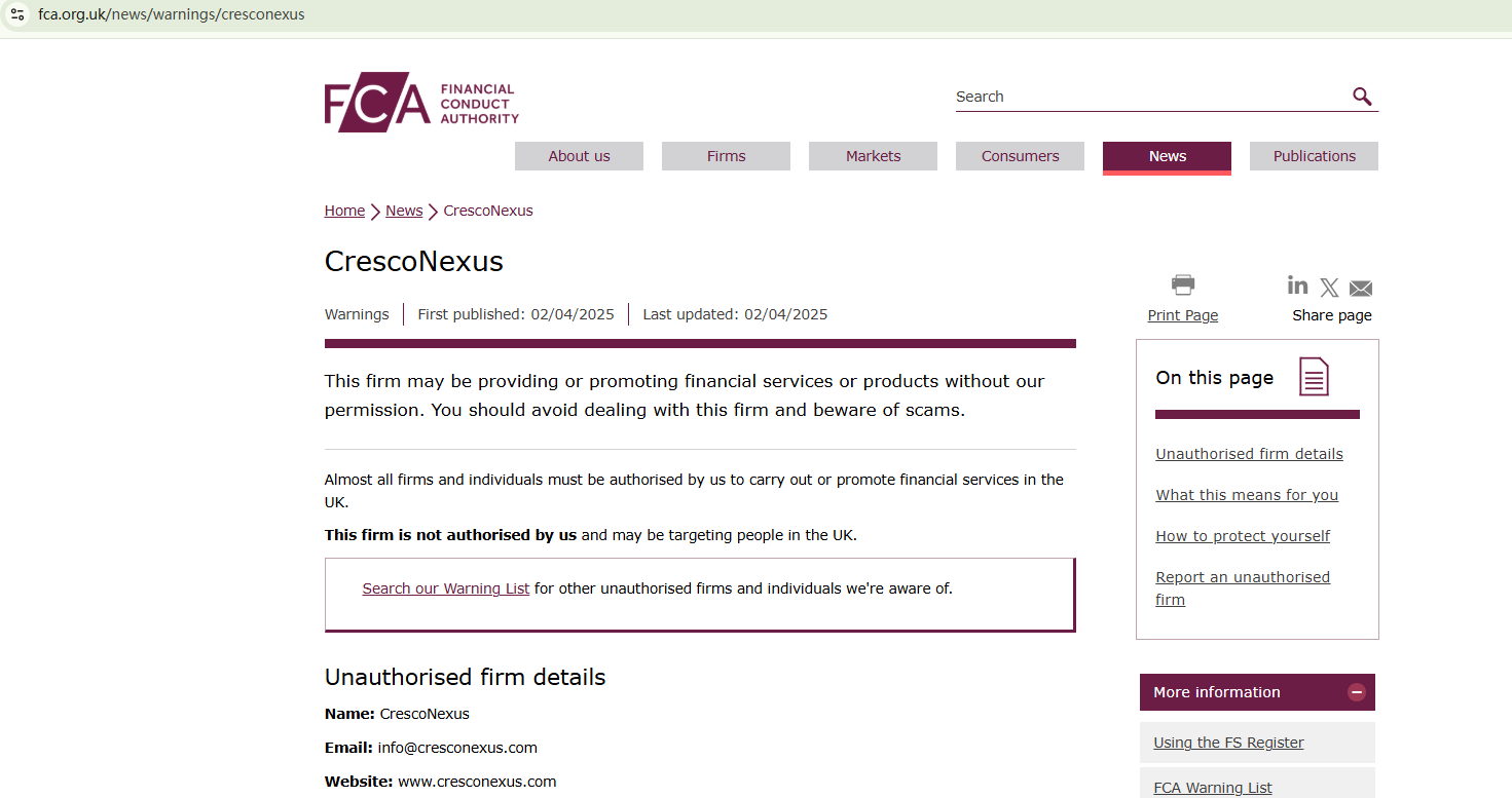 On April 2nd, 2025, the Financial Conduct Authority (FCA) issued a warning against CrescoNexus, believing this company might be providing financial services or products without proper authorization in the UK. https://www.fca.org.uk/news/warnings/cresconexus