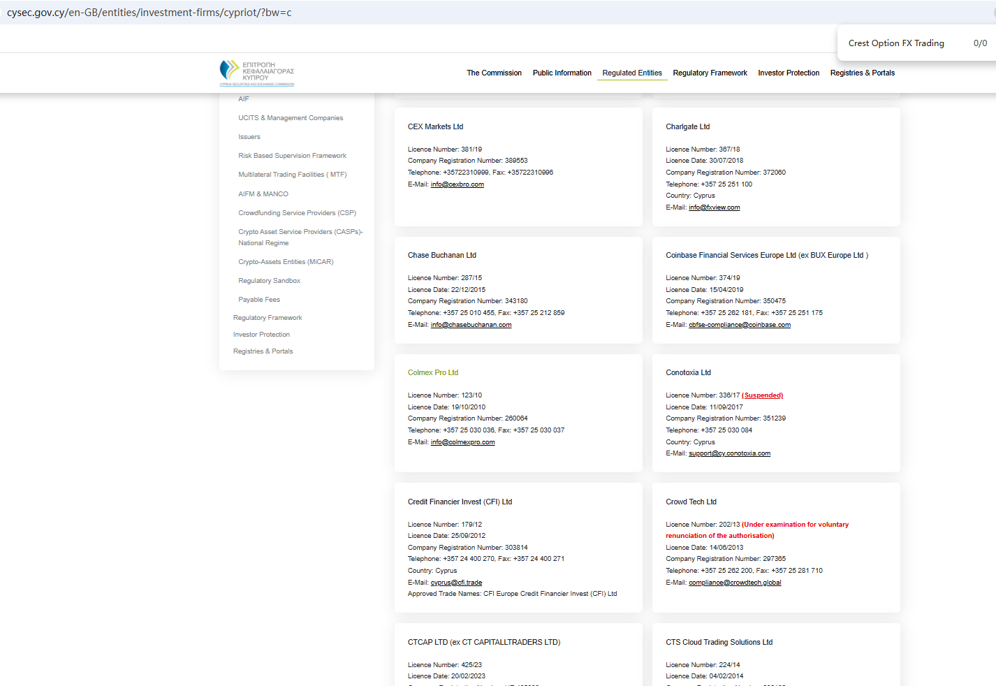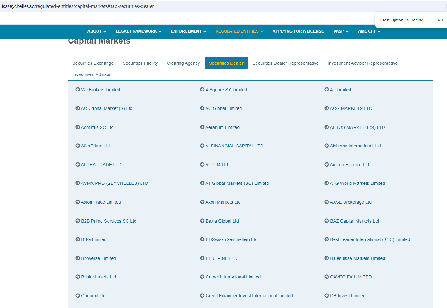 According to its website, it claims to be regulated by the Financial Conduct Authority (FCA), the Australian Securities and Investments Commission (ASIC), the Cyprus Securities and Exchange Commission (CySEC), the Financial Services Authority of Seychelles (Seychelles FSA), and the Securities Commission of The Bahamas (SCB). Upon investigation, no matching information was found in the FCA, CySEC, FSA, or the SCB. In addition, the Australian Securities & Investments Commission (ASIC) issued a warning against Crest Option FX Trading, believing this company might be providing financial services or products without proper authorization.