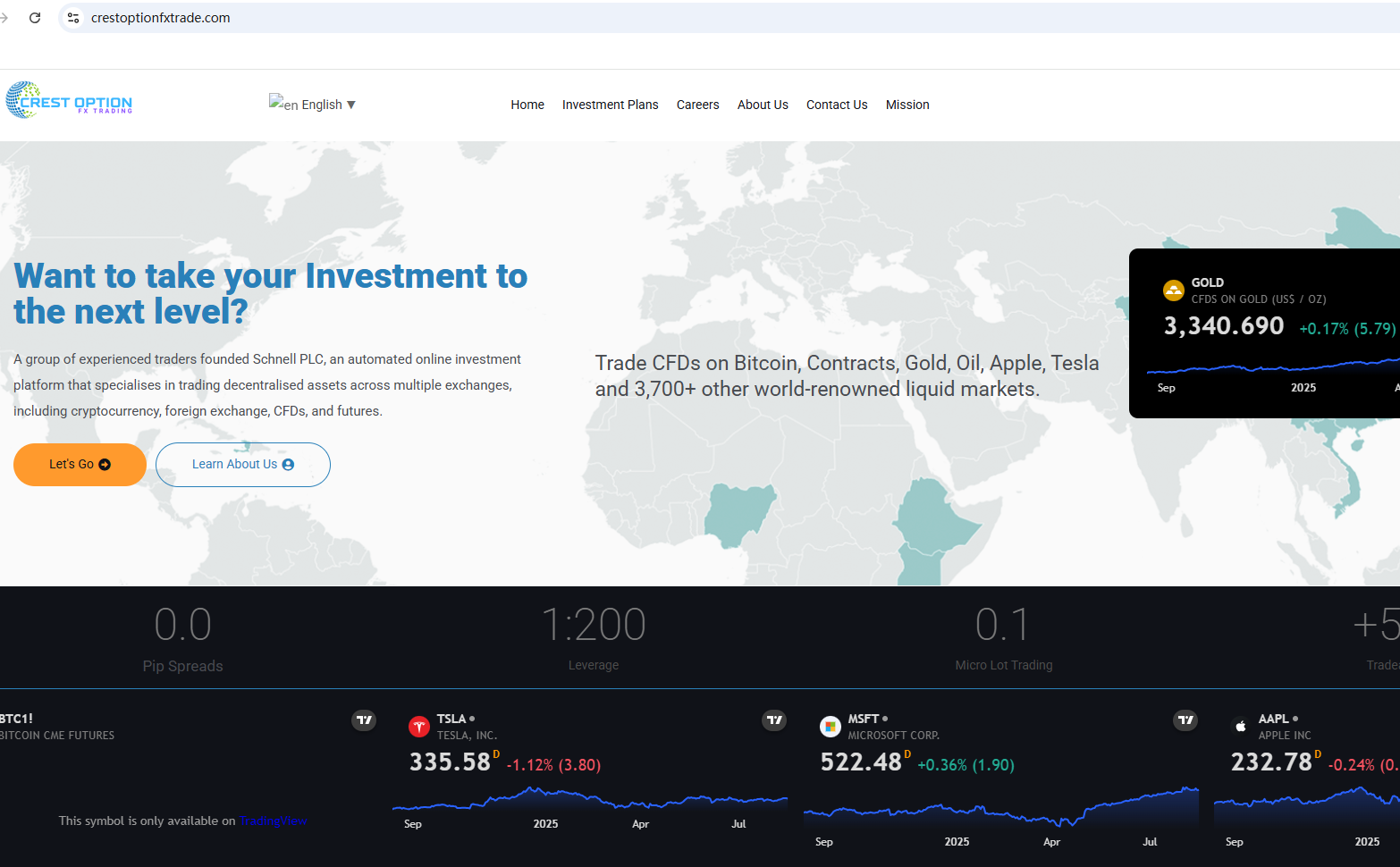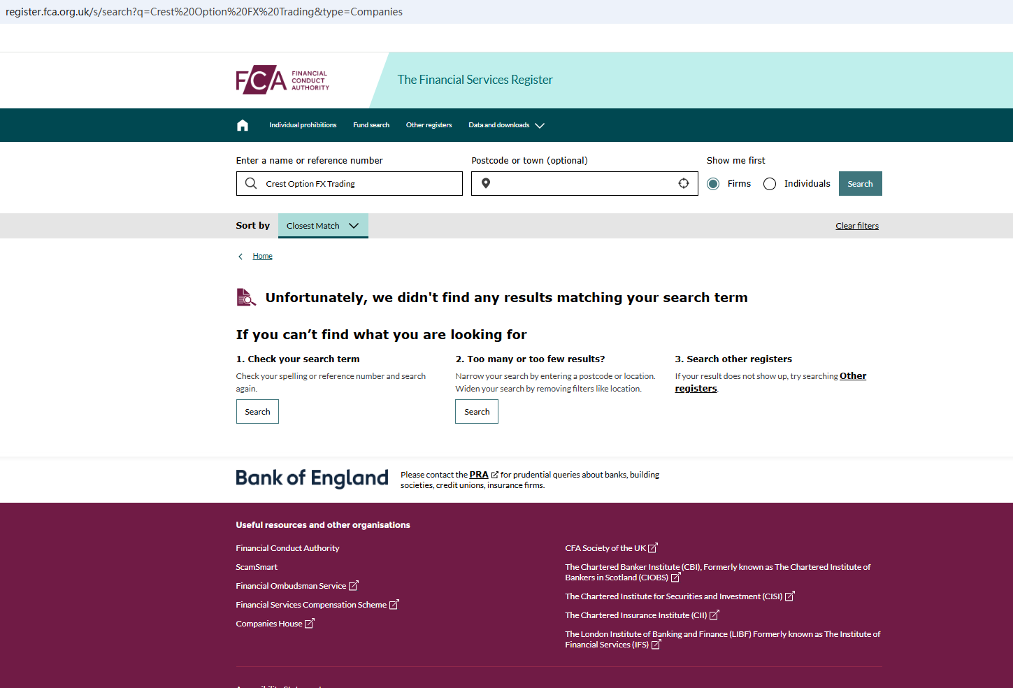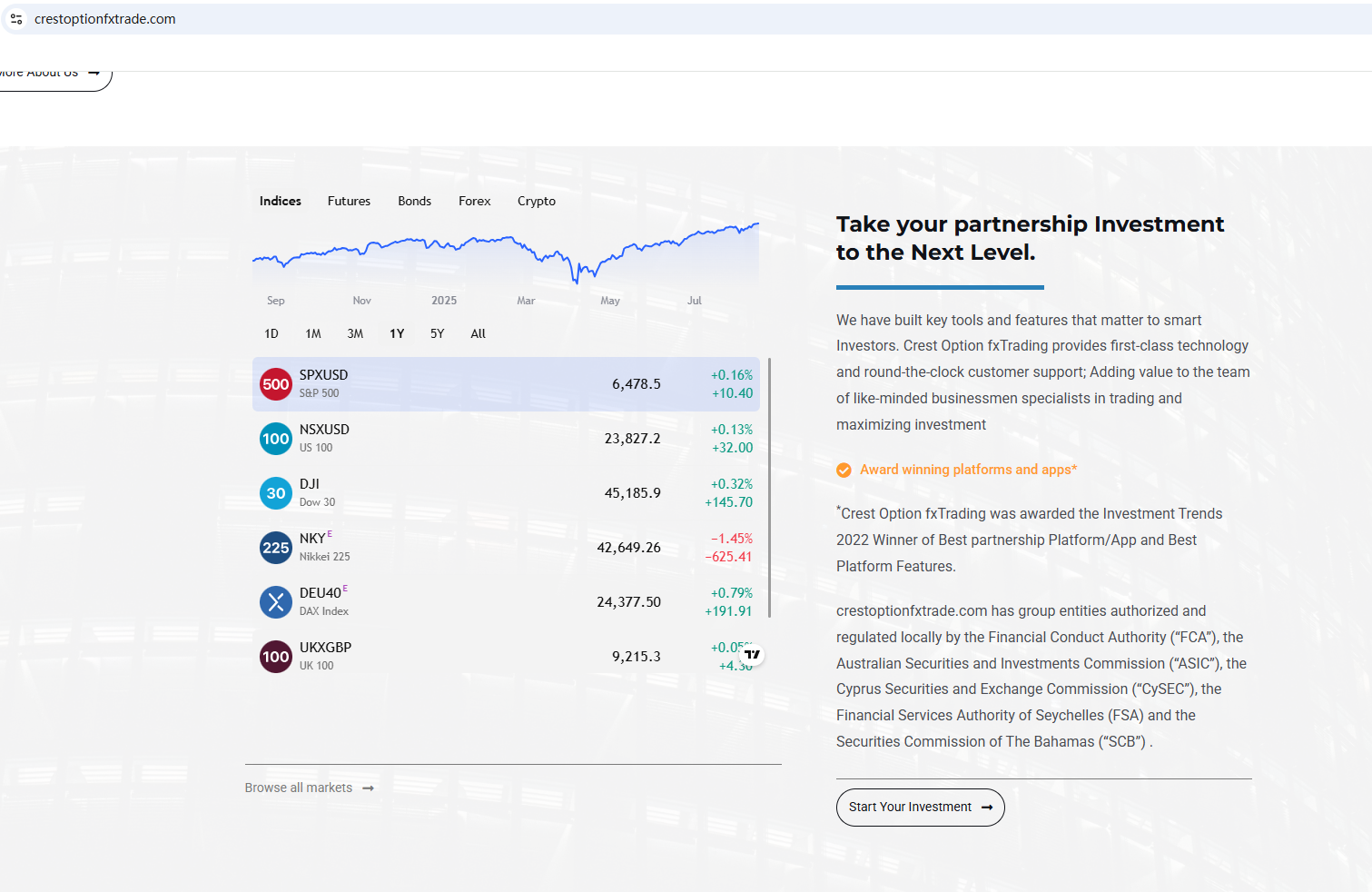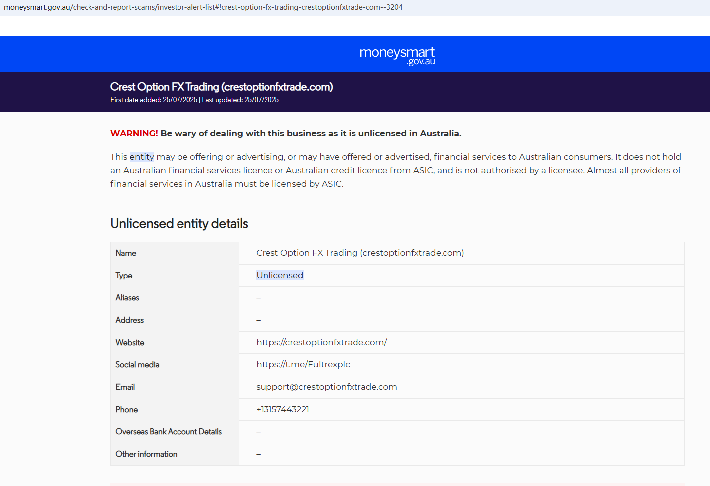 On Jul 25, 2025, the Australian Securities & Investments Commission (ASIC) issued a warning against Crest Option FX Trading, believing this company might be providing financial services or products without proper authorization. https://moneysmart.gov.au/check-and-report-scams/investor-alert-list#!crest-option-fx-trading-crestoptionfxtrade-com--3204