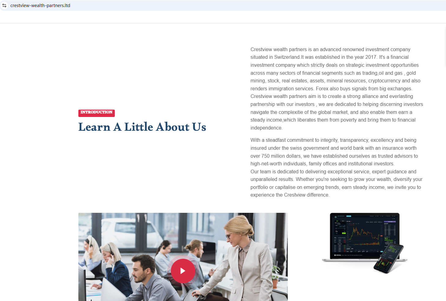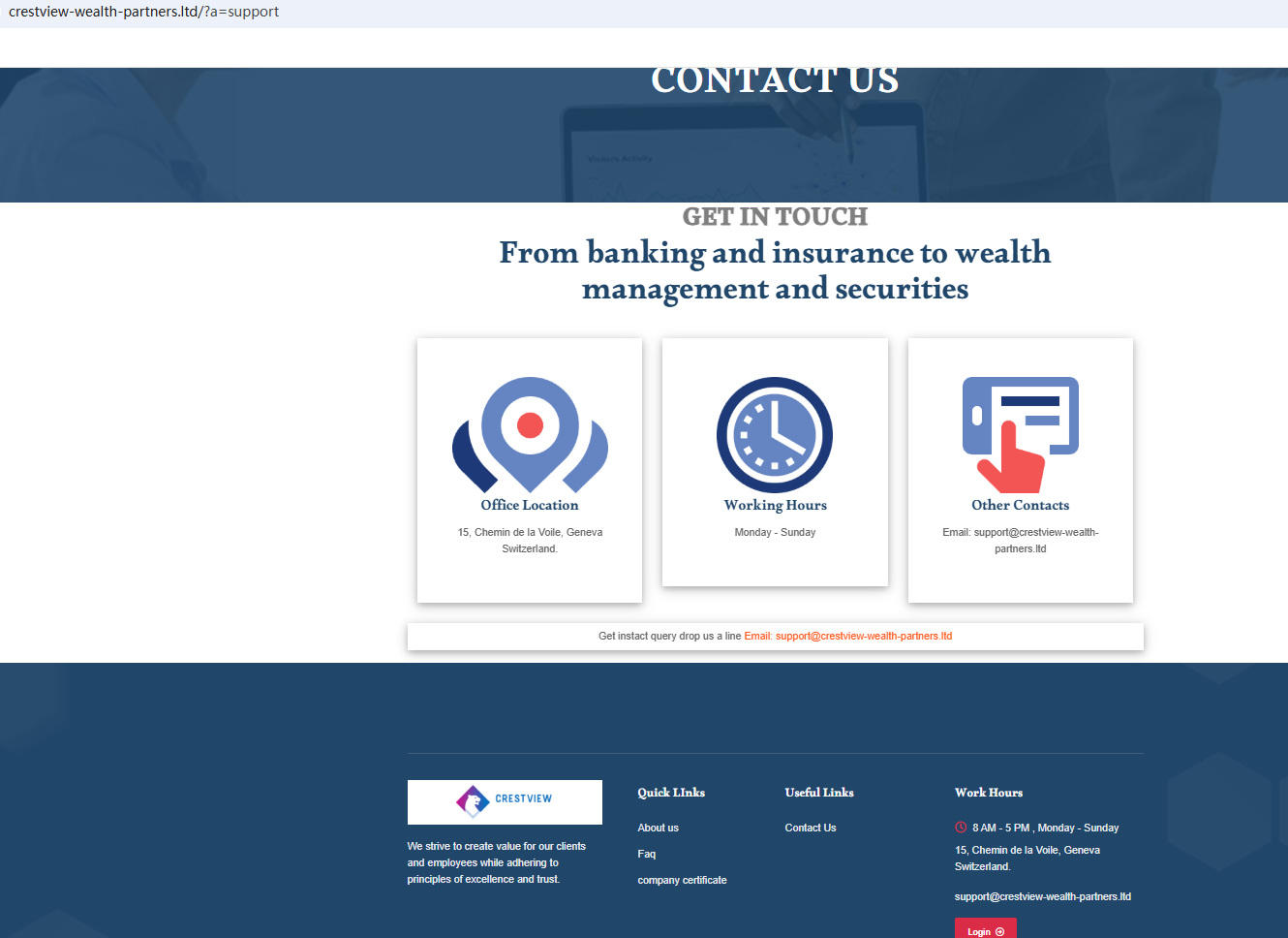 According to its website, it claims that the company was established in Switzerland in 2017. After checking, we found that its domain name was not established until 2025, and the Swiss Financial Market Supervisory Authority (FINMA) issued a warning against Crestview Wealth Partners Ltd, stating that this broker is not entered in its commercial register.. This is a very dishonest performance. Investors should stay away from this company.