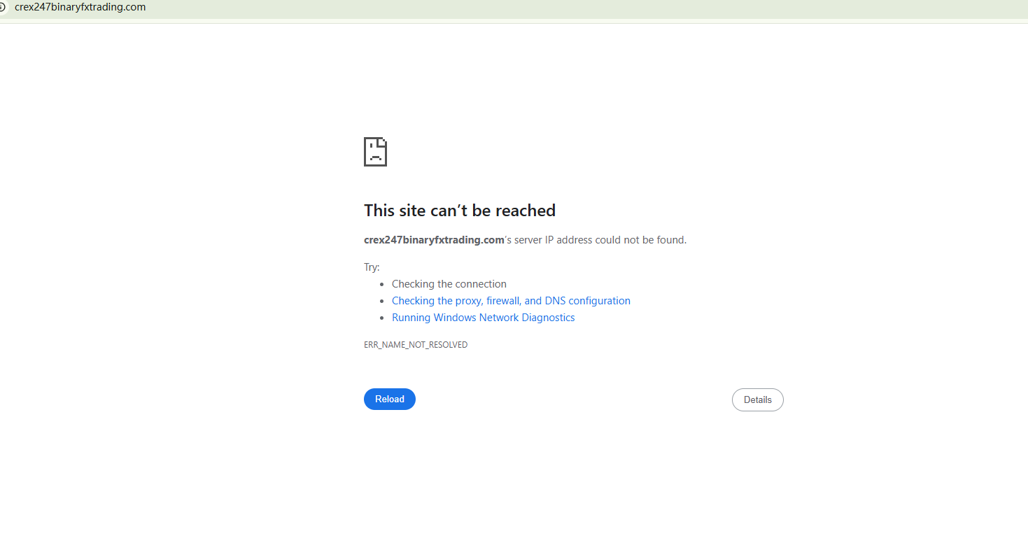BrokersView found that the domain "https://crex247binaryfxtrading.com/" is currently inaccessible. This is widely regarded as a significant red flag, as the suspension of a broker's website often points to underlying regulatory or operational issues.