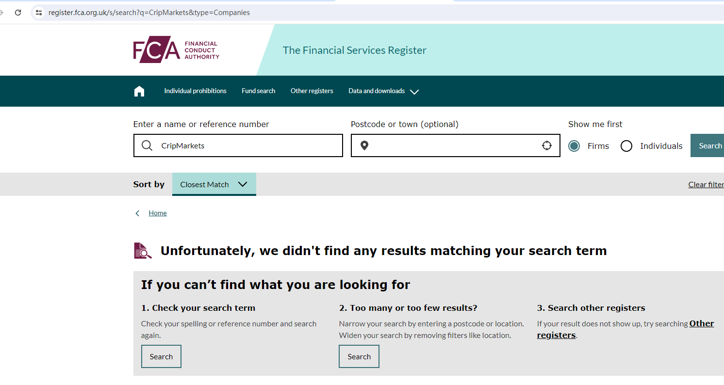 BrokersView found that the domain "https://cripmarkets.com/" is currently inaccessible. This is widely regarded as a significant red flag, as the suspension of a broker's website often points to underlying regulatory or operational issues.
