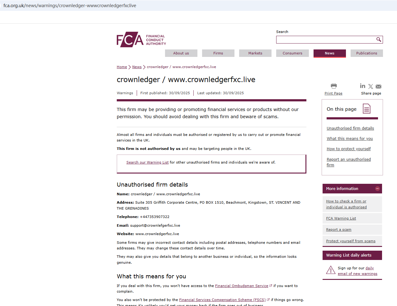 On September 30, 2025, the Financial Conduct Authority (FCA) issued a warning regarding crownledger, suspecting that this company may be offering financial services or products without the necessary authorization. https://www.fca.org.uk/news/warnings/crownledger-wwwcrownledgerfxclive
