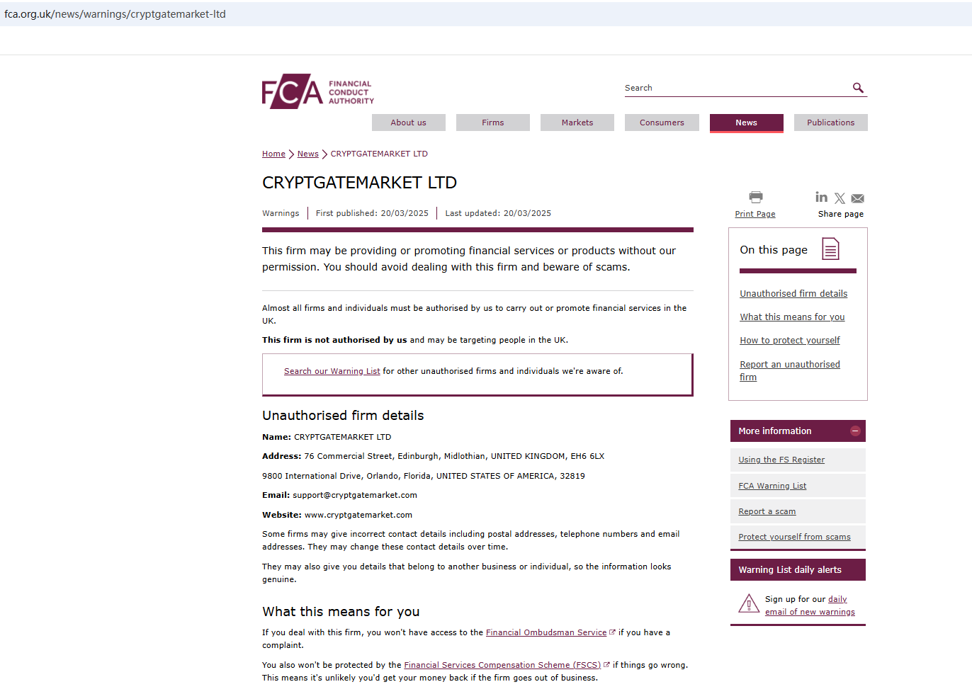 On March 20, 2025, the Financial Conduct Authority (FCA) issued a warning against CRYPTGATEMARKET LTD for the lack of the required authorization. https://www.fca.org.uk/news/warnings/cryptgatemarket-ltd