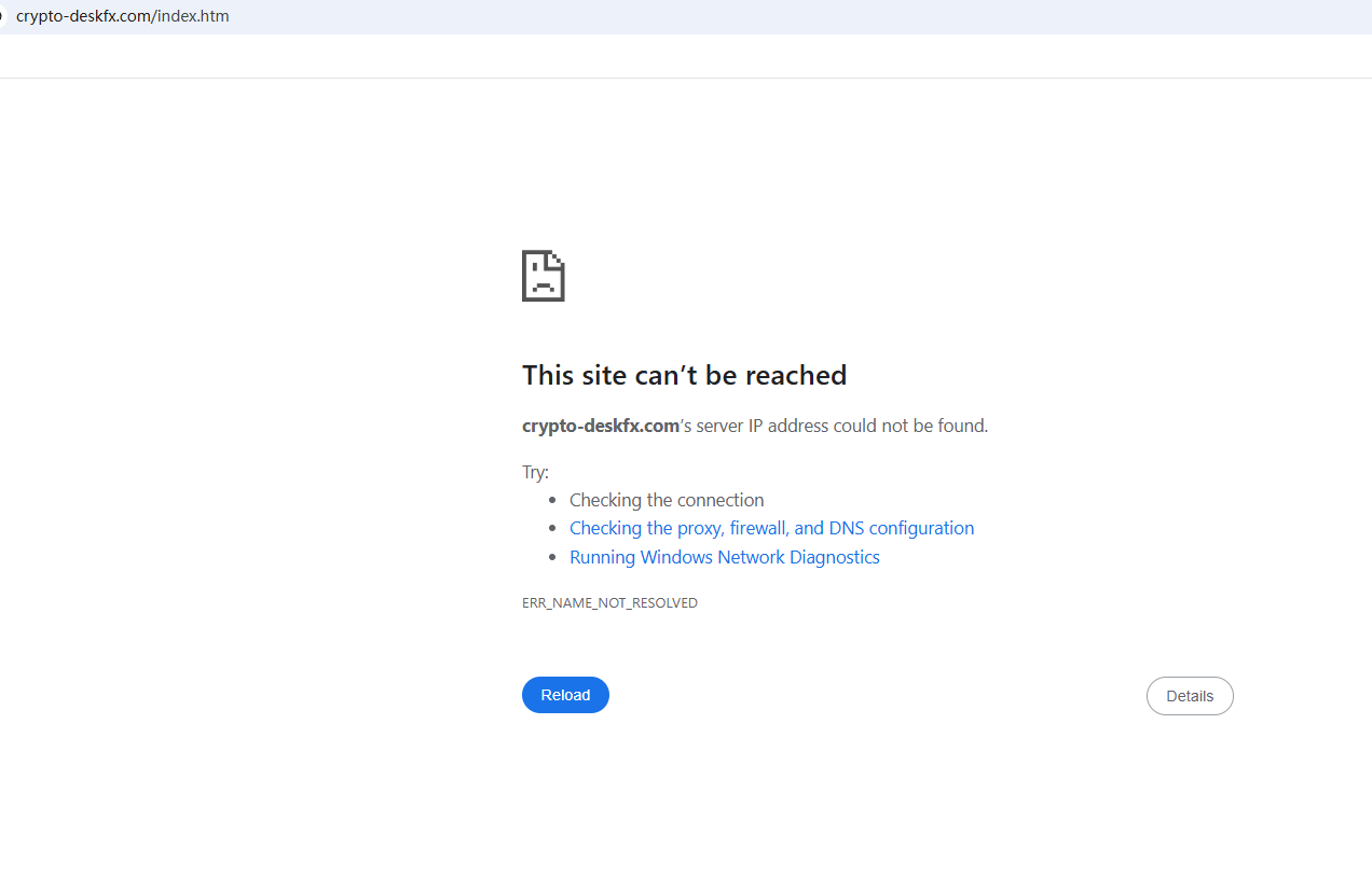 BrokersView found that the domain "https://crypto-deskfx.com/index.htm" is currently inaccessible. This is widely regarded as a significant red flag, as the suspension of a broker's website often points to underlying regulatory or operational issues.