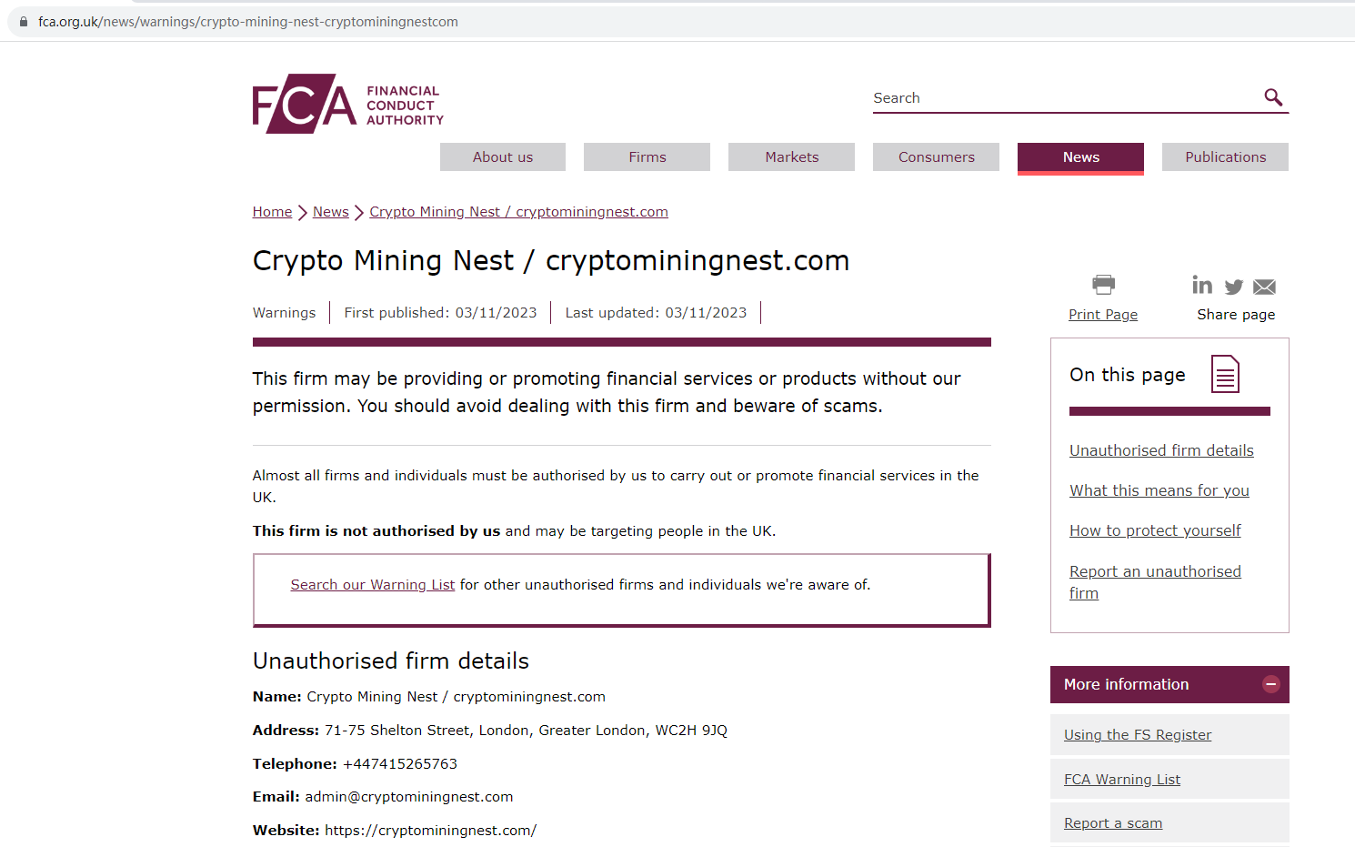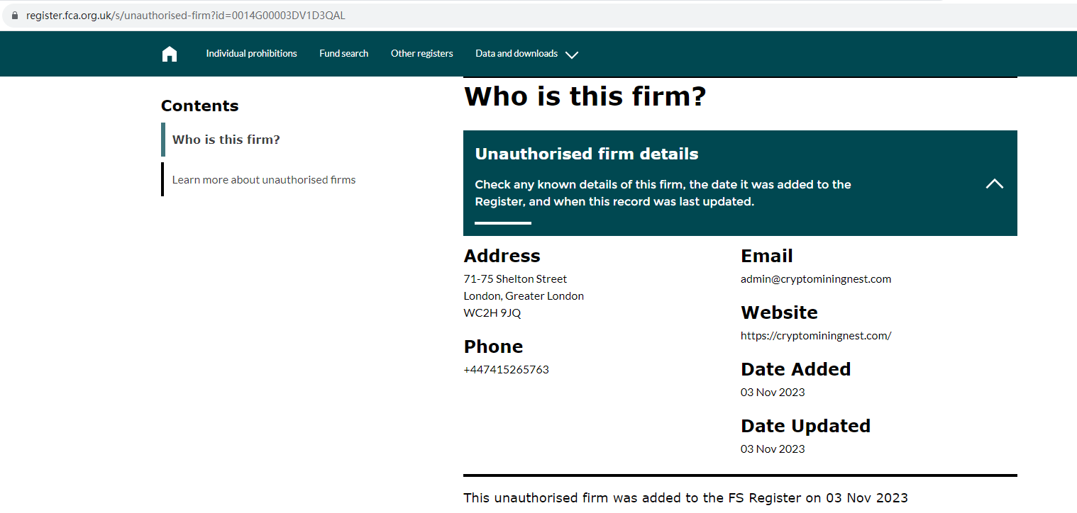 On 3 November 2023, the United Kingdom Financial Conduct Authority (UK FCA) issued a warning that Crypto Mining Nest was providing financial services or products in the UK without authorisation. You may visit: https://www.fca.org.uk/news/warnings/crypto-mining-nest-cryptominingnestcom