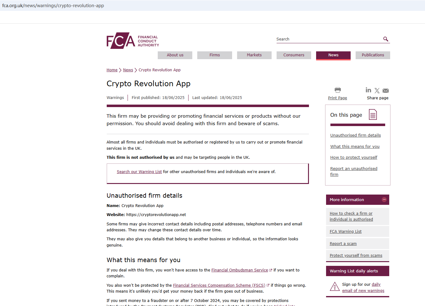 On Jun 18, 2025, the Financial Conduct Authority (FCA) issued a warning against Crypto Revolution App, believing this company might be providing financial services or products without proper authorization in the UK. https://www.fca.org.uk/news/warnings/crypto-revolution-app