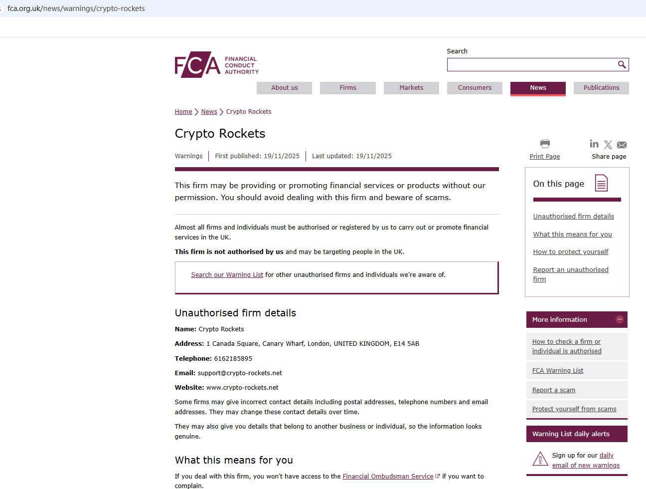 On Nov 19, 2025, the Financial Conduct Authority (FCA) issued a warning regarding Crypto Rockets, suspecting that this company may be offering financial services or products without the necessary authorization. https://www.fca.org.uk/news/warnings/crypto-rockets