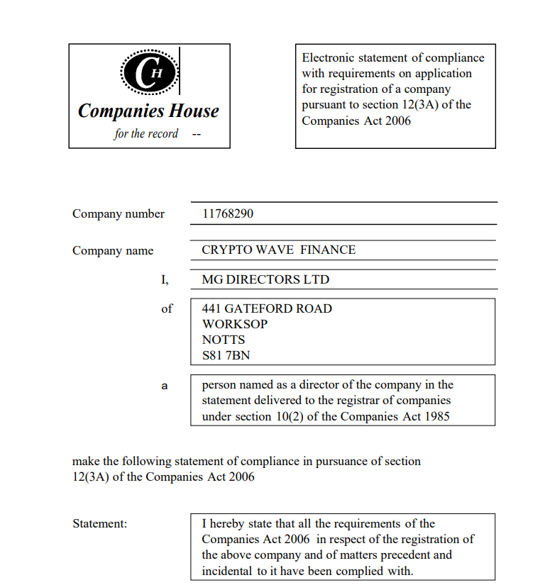 According to its website, CRYPTO WAVE FINANCE claims that regulated by Companies House(CH) with registration number 11768290. However, after verification, we found that the company information under the number did not match it.